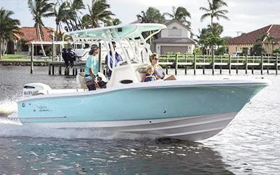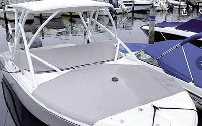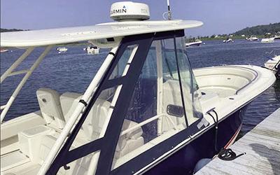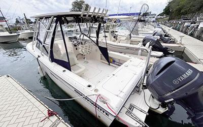 DF150TXW Fuel Injected Four Stroke Outboard on the back. T-Top with Spray Shield, Gull Wings and Console Cover(a49946)