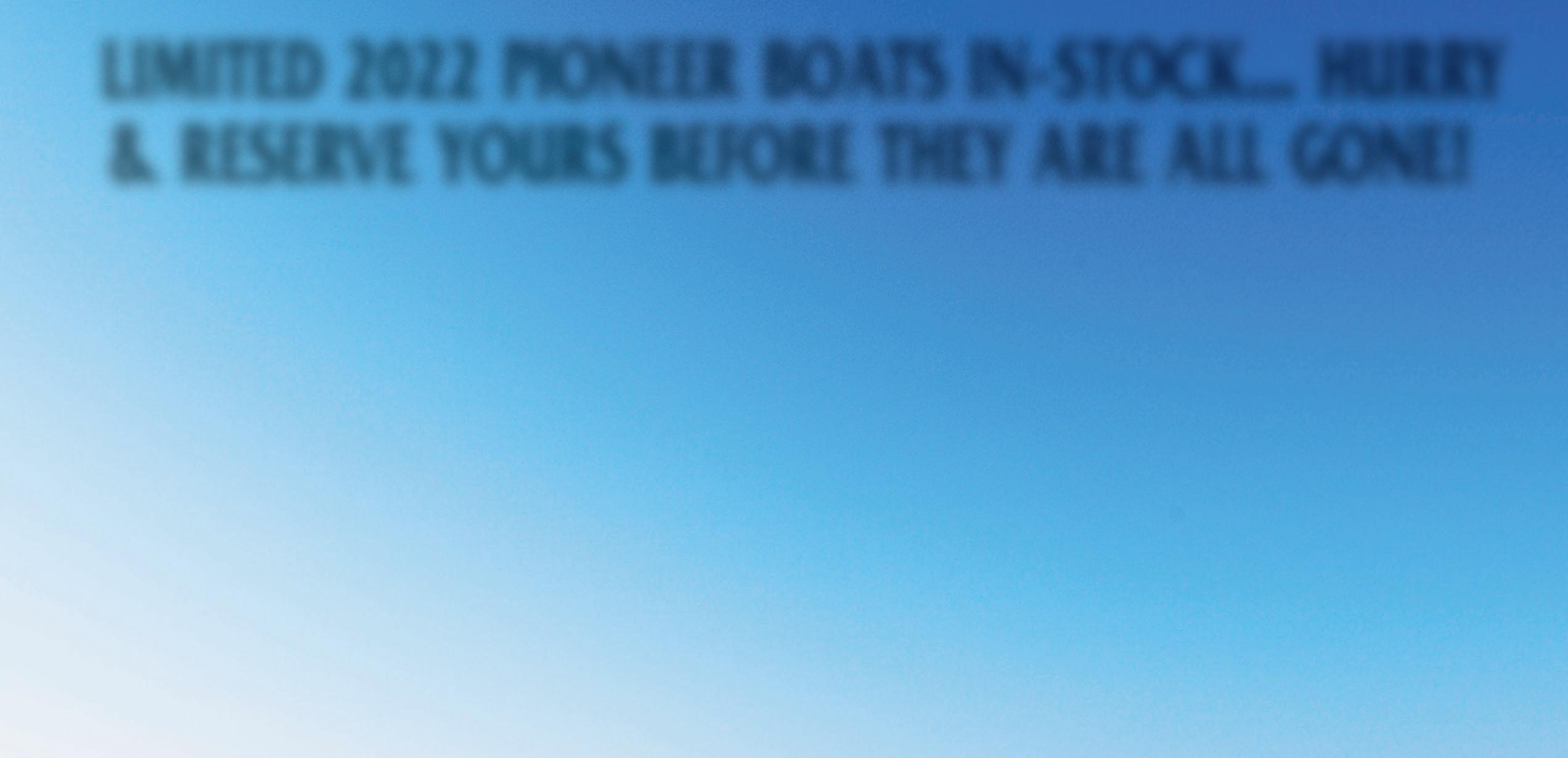ALL BOATS INCLUDE FULL 2 YEAR SCHEDULED MAINTENANCE AND GARMIN GPS AND VHF! 2022 Pioneer 222 Sportfish with Suzuki 300HP Powder CoatedT-Top Call For a Quote 2022 Pioneer 202 Sportfish with Suzuki 200HP Powder CoatedT-Top Call For a Quote Sportfish202 2022 Pioneer 202 Islander with Suzuki 200HP Powder CoatedT-Top Call For a Quote 2022 Pioneer 180 Islander with Suzuki 140HP Powder CoatedT-Top Call For a Quote Islander202 Islander180 LIMITED 2022 PIONEER BOATS IN-STOCK... HURRY & RESERVE YOURS BEFORE THEY ARE ALL GONE! Sportfish222