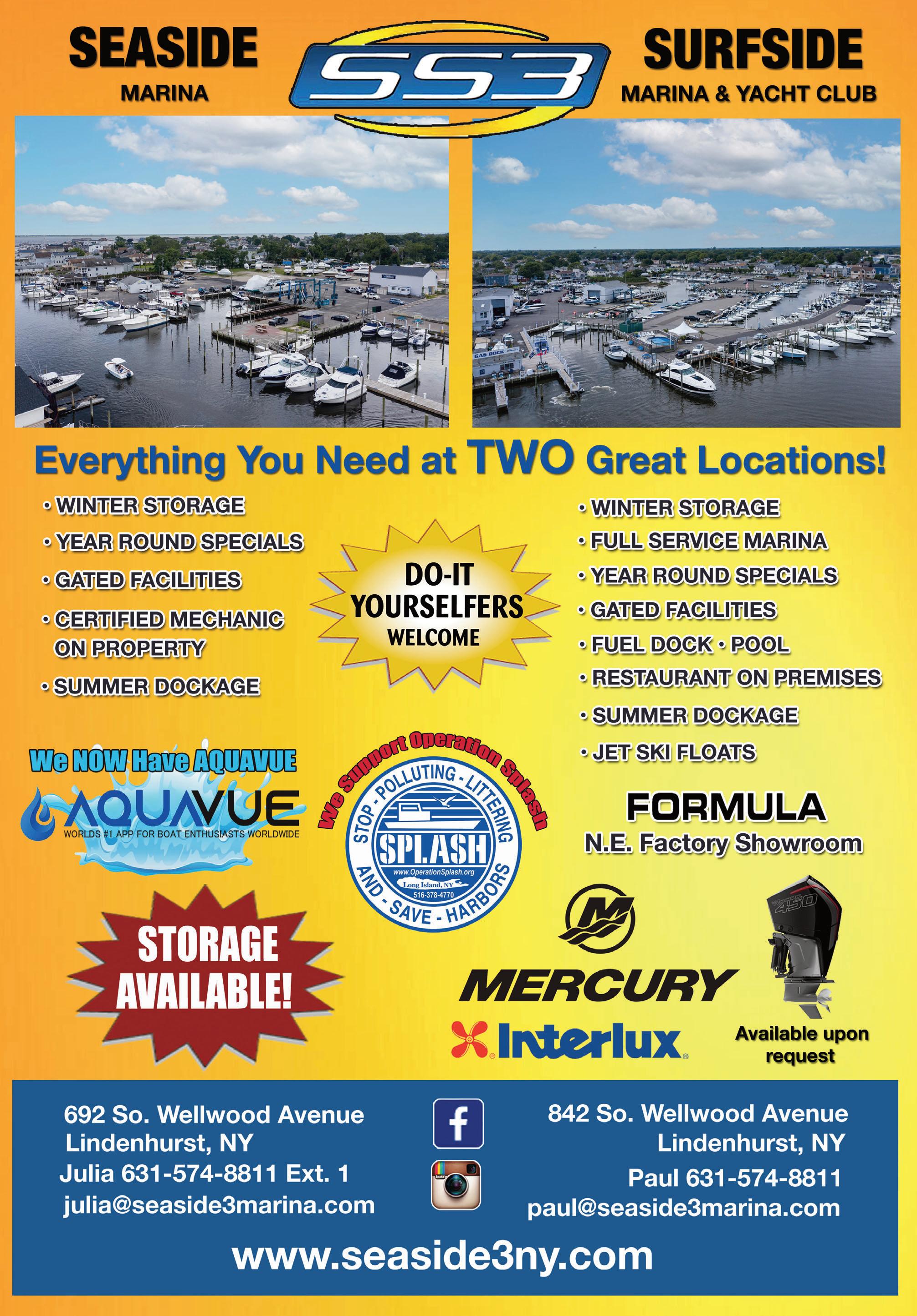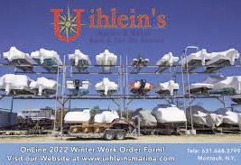 ENGINES Call Direct Deer Park, New York 631•242•5757 Dealers Protected TRANSMISSION BENCH TESTED $150 EXCHANGE UNITS AVAILABLE L ONG I SLAND Marine Engine Transmission Inc. L ONG I SLAND Marine Engine Transmission Inc. AND AND Visit Our New Location DEBIT Call Direct OUTBOARD MARINE SERVICEInc. OUTBOARD MARINE SERVICEInc. SALES/SERVICE/PARTS Factory Certified Technicians 24 Cottage Ave. Bayshore, NY 11076 631.665.3885 • Repower Specialists • Tune Ups • Warranty Work • Transporting Travel Lift Service Winter Storage Winterization Specialists SBayMarine.com 631-587-0000 •Winter Storage •Winterizing & Shrinkwrapping •Two travel lifts Up to 50’ •All Stern Drives/Outboards/Inboards •Repower Specials 203 South Ketcham Ave., Amityville, NY 11701 FULL SERVICEFULL SERVICE MARINA MARINA Call Direct EPMARINE EPMARINE FACTORY TRAINED MASTER TECHNICIANS OUTBOARD SPECIALISTS REBUILT POWERHEADS & GEAR CASES AVAILABLE N E W & U S E D M O T O R S • Yamaha • Mercury CALL FOR WINTERIZING SPECIALS CALL ERIC 631-563-6277 2200 ARCTIC AVENUE,BOHEMIA, NEW YORK 11716 MarineManifoldCorp.com Manufacturers of Wet or Dry Exhaust Systems for Over 35 Years 134 Verdi St.Farmingdale NY 11735 631-694-0714 • RISERS • MANIFOLDS • EXHAUST ACCESSORIES • Replacement Manifolds & Risers • Manufacturers of Custom Wet or Dry Exhaust Systems Since 1955