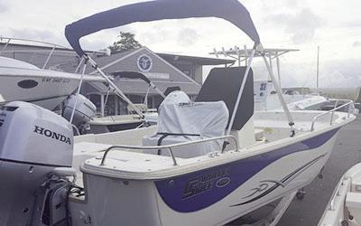 150 HP Honda four stroke outboard engine with a SST prop. Includes fiberglass T-Top with electronics box, LED lights , rod holders and more $39,990 (c54204)