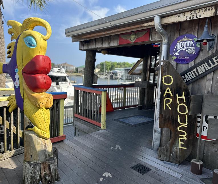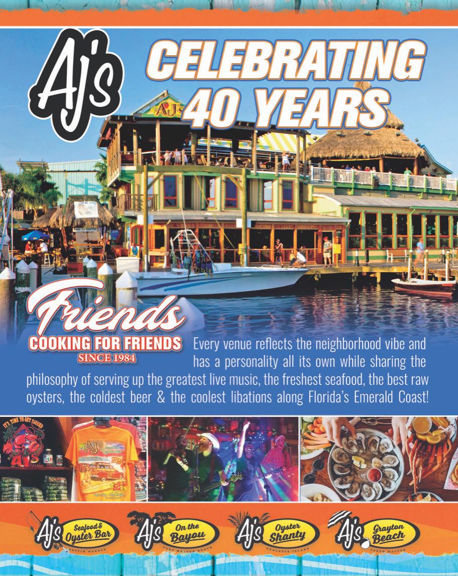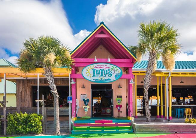 This unique restaurant’s open space and large windows give you an airy feel of picturesque St. Andrews Bay, and their cuisine offerings re ect the Panama City coastal history with a menu inspired by Southern avors and fresh Gulf seafood. From smoked tuna dip to oysters on the half shell or crab claws, Harrison’s has something for most any taste; even you sh sandwich, grouper taco, and chicken salad sandwich folks. You can oat up and dine in, but if you’re hitting this hotspot for dinner, call ahead for those after 4:00 P.M. reservations before you decide to dock it.