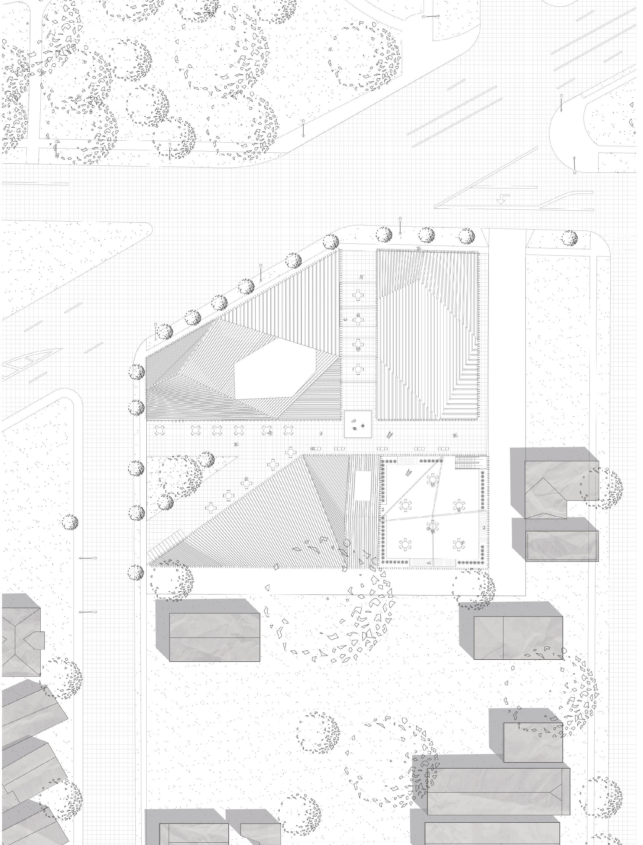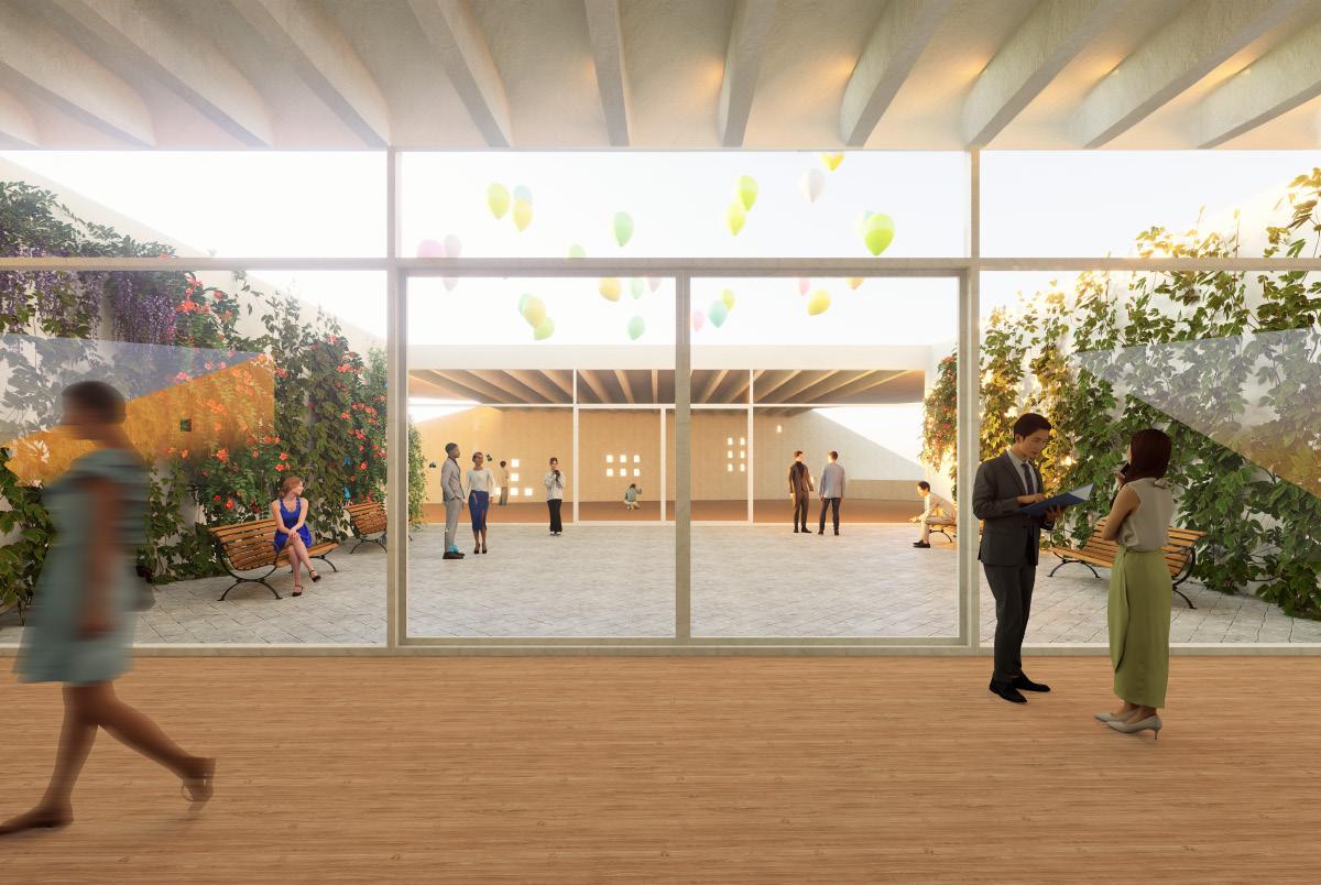 The forefront of the design hosts a diverse range of programming, featuring an entrance compelled with contemplative graveyard area, complemented by a vibrant painting space situated on the second floor.