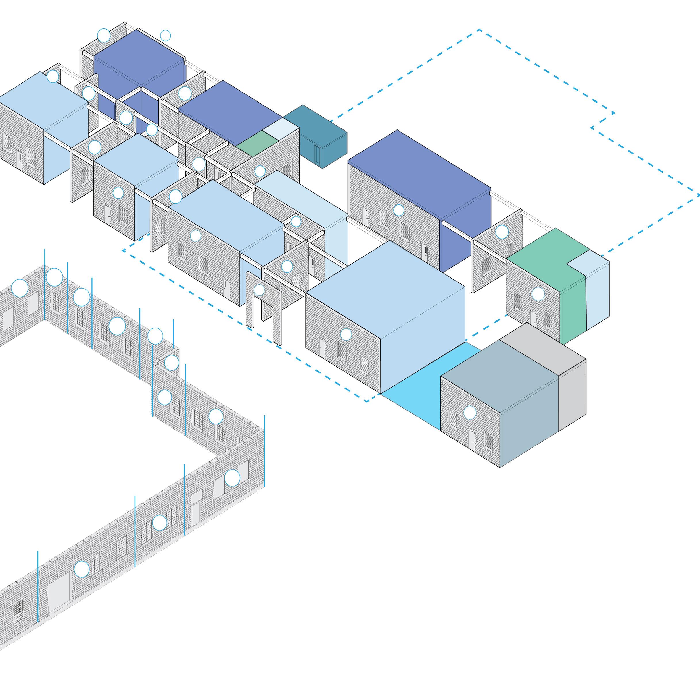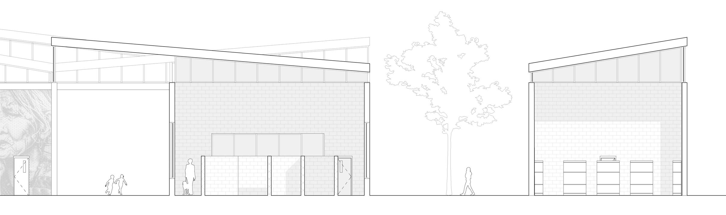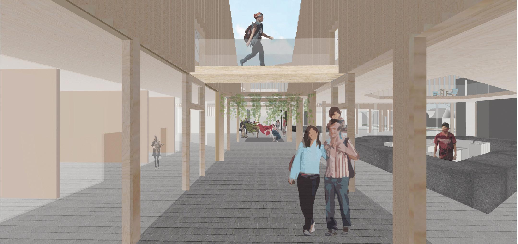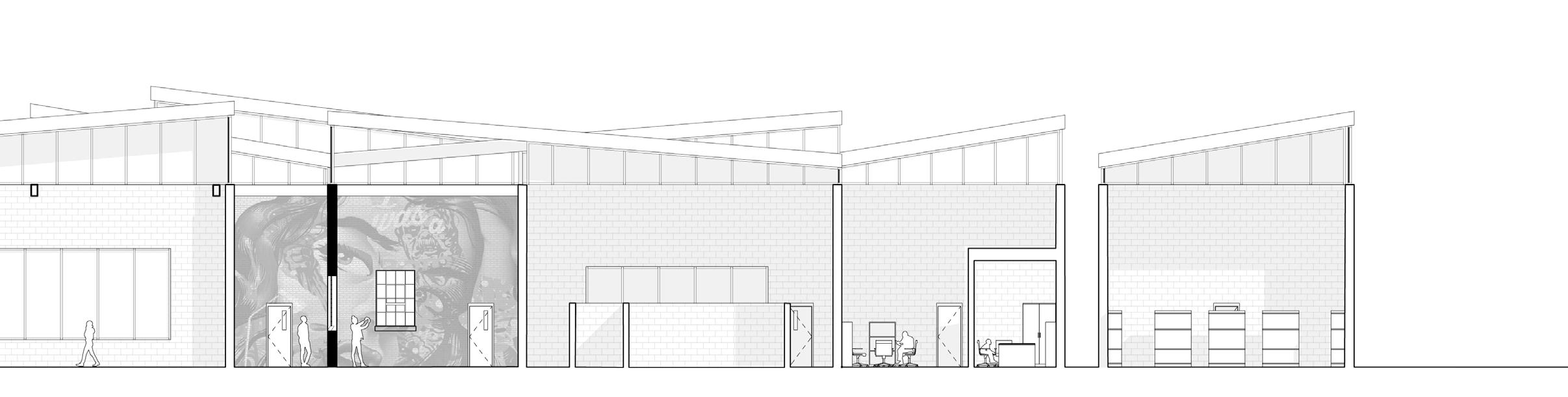 Breaking up the existing walls, opens up spaces for new structures but also creates a dynamic environment for the vibrant culture of street art. The broken walls also represent a break from the past while also starting a fresh canvas for the future. The walls that are divided and not connected with new walls will be supported by trusses from the original building, serving as structural support for the freestanding walls.