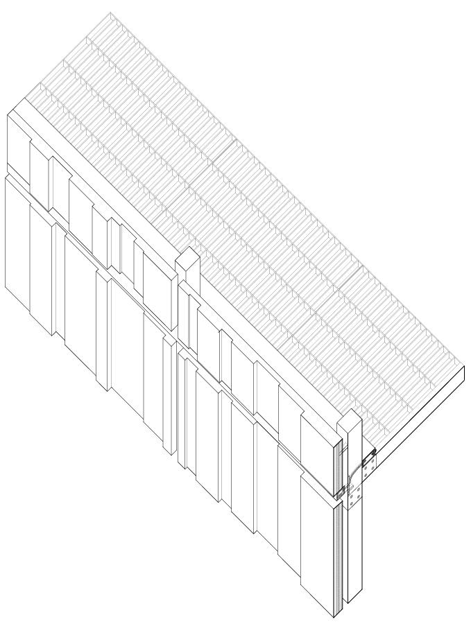 8 x 16 x 8 CMU inner wythe with 3-#5 vertical rebar grouted solid at corners, each side of large openings, and 48 inches OC; horizontal joint reinforcement at 16 inches OC.
