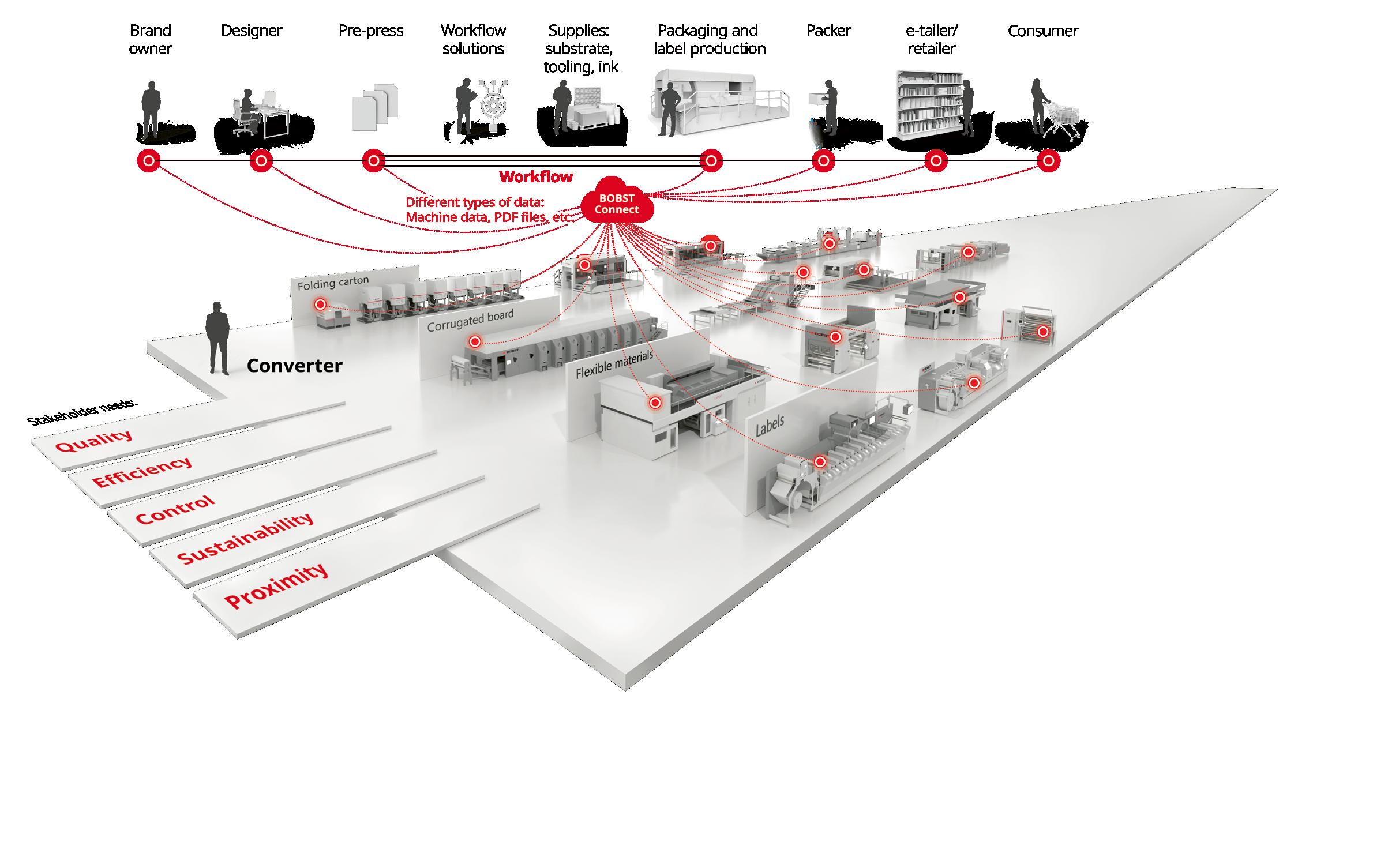 BOBST is driving connectivity: in a fully connected packaging production, all machines, tooling and systems will “talk” to each other. Stakeholders can access and share data, through a cloud-based platform.