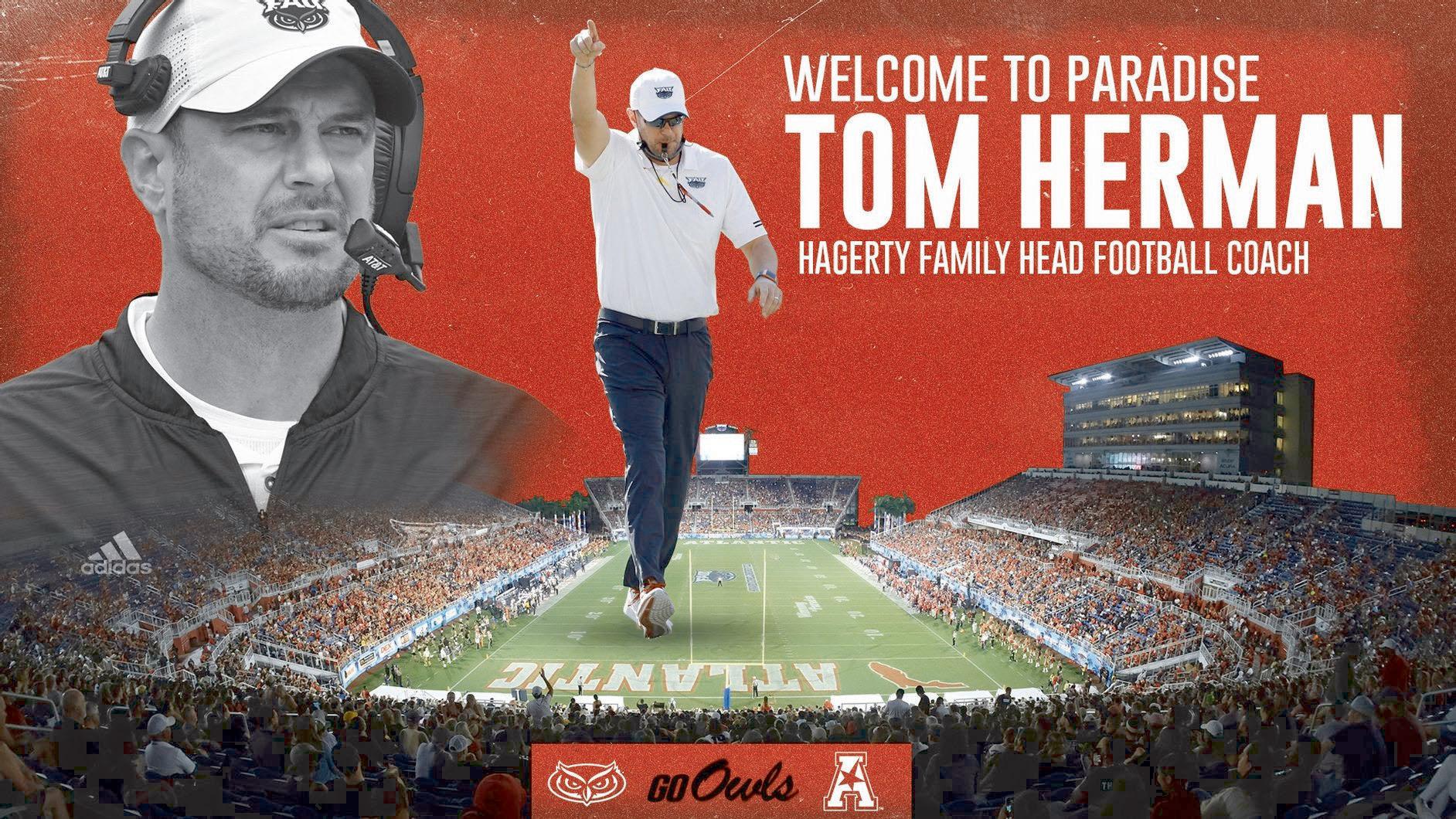 Tom Herman has been named Hagerty Family Head Football Coach at Florida Atlantic University, Vice President and Director of Athletics Brian White announced Thursday.