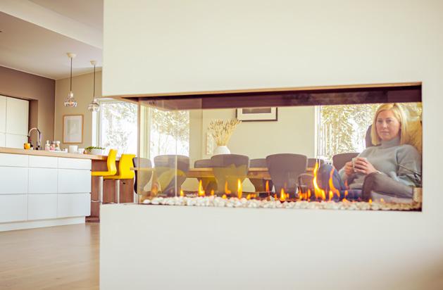 Den elegante gasspeisen skiller stua fra spisestua, og med glass på begge sidene får man stor glede av den både rundt middagsbordet og fra stua. Vi var litt spente på hvordan det ville bli med en gasspeis, men vi er utrolig fornøyde med løsningen vi gikk for. «Det er en koselig og praktisk løsning som er lett å kombinere med et litt travelt hverdagsliv. Jeg sitter gjerne i godstolen framfor peisen når jeg trenger en liten time-out», forteller Lisbeth.