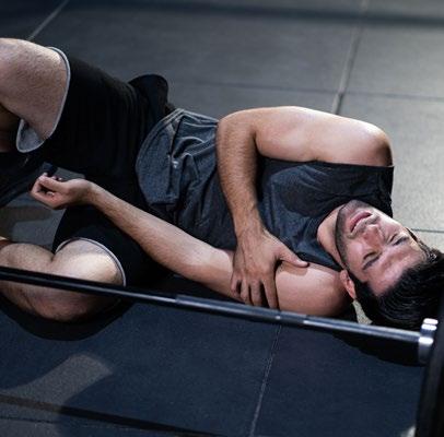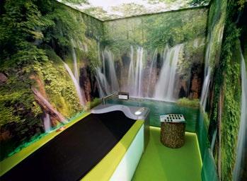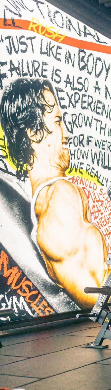 trainieren. Auch hier sorgt die dunkle Beleuchtung in Kombination mit dem richtigen Design für die passende Atmosphäre. Wandmotive wie das von „The Rock” wurden perfekt in das Designkonzept integriert und sorgen für einen zusätzlichen Motivationsschub beim Training.