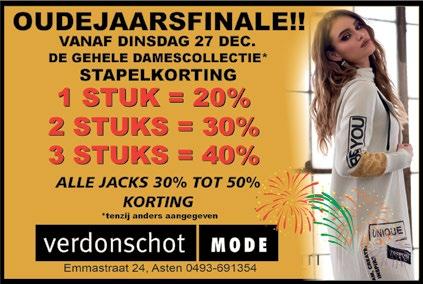 of ziektekosten verzekering? • U zoekt voor uw bedrijf / OR ondersteuning bij herziening van de pensioenregeling? Zo ja, wendt U zich dan tot de specialist op het gebied van pensioen-, lijfrente- en overige levensverzekeringen Mr. H.C.M. Looijmans belastingkundige Nieuwendijk 70 5712 EN Someren tel 0493-440115 fax 0493-440116 Tandprothetische praktijk - Tandprothetiek - Klikgebit - Reparaties - Esthetische oplossingen - Implantologie Julianastraat 38 5721 GL Asten tel. 0493-697443 www.depolders.nl WWW.DEPOLDERS.NL Inschrijven nieuwe patiënten mogelijk Runderlende (entrecote) bakken als biefstuk Bouillonvlees voor een heerlijke kerstsoep Vlugklaar: Kip Cajun (iets pittiger) Varkensfricandeau stuk / lapjes 100 gram 1 99 500 gram 5 45 500 gram 4 95 500 gram 695 AKTIES GELDIG VAN DONDERDAG 22 DECEMBER T/M WOENSDAG 4 JANUARI Wij hebben een ruim assortiment kant en klaar maaltijden Kant & klaar: Varkenshaas in champignon roomsaus 500 gram 8 45 Vleeswaren: Gekookte achterham 100 gram 1.99 Boerenham 100 gram 2.19 Pain d’Ardenne 100 gram 1.99 Staafpaté 100 gram 1.59 Thomas Koppens, keurslager Kerkstraat 30, Someren, tel. 0493-491437 www.koppens.keurslager.nl info@koppens.keurslager.nl Elke week verrassende aanbiedingen Keurslager Thomas Koppens, Verstand van Lekker Vlees Openingstijden: van dinsdag t/m vrijdag open van 8.00 uur tot 18.00 uur. En op zaterdag 31 december open van 7.00 uur tot 13.00 uur. Thomas Koppens Keurslager wenst u fijne Kerstdagen en ziet u na Kerst volgende week weer graag in de slagerij. START OPRUIMING Op de gehele collectie 15% tot 50% korting* *m.u.v. Mephisto Onze merken o.a Ecco, Rieker, Ara, Remonte, Mephisto, Verhulst, Caprice, Tamaris, Jenszen Van Best Schoenen Officieel Ecco en Mephisto-dealer voor Deurne en omgeving Stationsstraat 3, Deurne, 0493-320712 www.vanbestschoenen.nl Op de gehele ECCO-collectie 15 TOT 50% KORTING Mephisto- en Verhulst restanten 20 TOT 40% KORTING