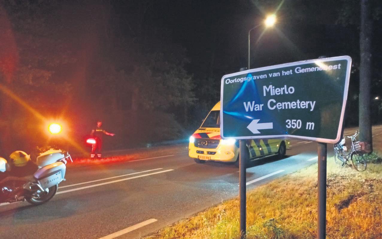 MIERLO - Een eenzijdig ongeval zaterdag aan de Geldropseweg in Mierlo. Een scooterrijder raakte van het fietspad en kwam in botsing met een verkeersbord. De bestuurder raakte gewond. (Foto: 112nieuwsonline.nl)