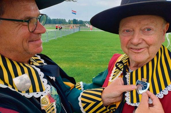 Rob Singels (links) koning van het gilde en 25 jaar lid, speldt bij Arno van der Aalst het herinnering schildje met gouden kroontje op, ter gelegenheid van zijn 60-jarig jubileum. (Foto: Louis Stofmeel)
