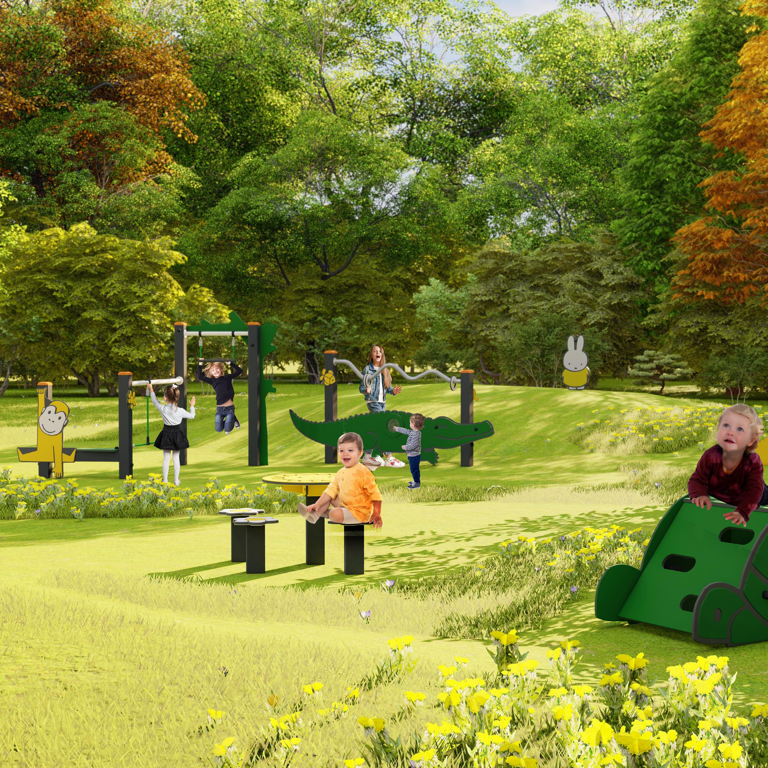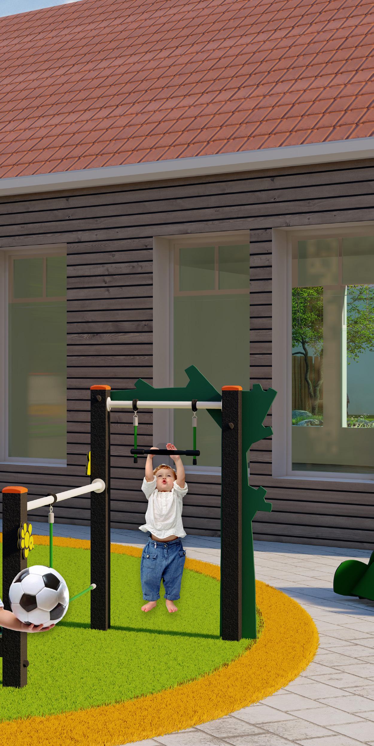 In unserem Design konzentrieren wir uns zunächst auf die motorische Entwicklung. Kleine Kinder sind intensiv damit beschäftigt, ihren Körper und die Welt um sie herum zu entdecken. Wir sorgen dafür, dass unsere Spielumgebungen sie herausfordern, zu klettern, zu rennen, zu balancieren und zu springen. Neben der körperlichen Aktivität halten wir es für essenziell, dass der Spielplatz auch Raum für kreatives und sinnliches Spiel bietet. Bunte, verspielte Elemente laden zum Entdecken und Experimentieren ein. So enthalten die Spielgeräte taktile Elemente wie drehbare Uhren, Küchen und Gießkanne, die Kinder zum Rollenspiel anregen und ihre Motorik und Fantasie fördern. Es gibt ihnen die Möglichkeit,
