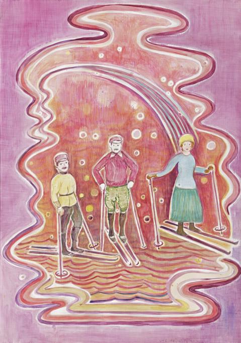 Im Atelier selbst hat Ute Fründt einige der neuesten Bilder auf dem Boden nebeneinandergestellt und an die Wand gehängt. Auf dem Tisch im Raum liegt eine Mappe mit großformatigen Papierarbeiten – im Grunde sind es Malereien auf Papier, ein Kapitel, das sie in dieser Intensität und Eigenständigkeit erst seit einigen Jahren ausformuliert und das noch weitgehend unveröffentlicht ist. Begonnen hat sie mit diesen Papierarbeiten während der Corona-Zeit und sie ist damit nach vielen Jahren wieder ganz zur menschlichen Figur als Sujet zurückgekehrt, parallel nun auch bei ihren Gemälden auf Leinwand. Die Protagonisten sind jetzt Männer mit Hüten, Zirkusartisten, Angler und Skiläufer. Auch wenn sie im Mittelgrund stehen oder von einem linearen Geflecht umhüllt werden oder wie in einer Schnee-