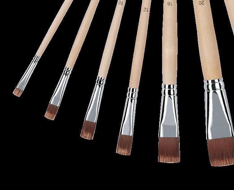 Flachpinsel. Kräftige, angespitzte Nylonborsten, nahtlose Aluminiumzwinge, langer Naturholzstiel. Für die Acryl-, Öl- und Gouachemalerei. Das Set beinhaltet folgende Größen: 6, 8, 10, 12, 16, 20 und 24.