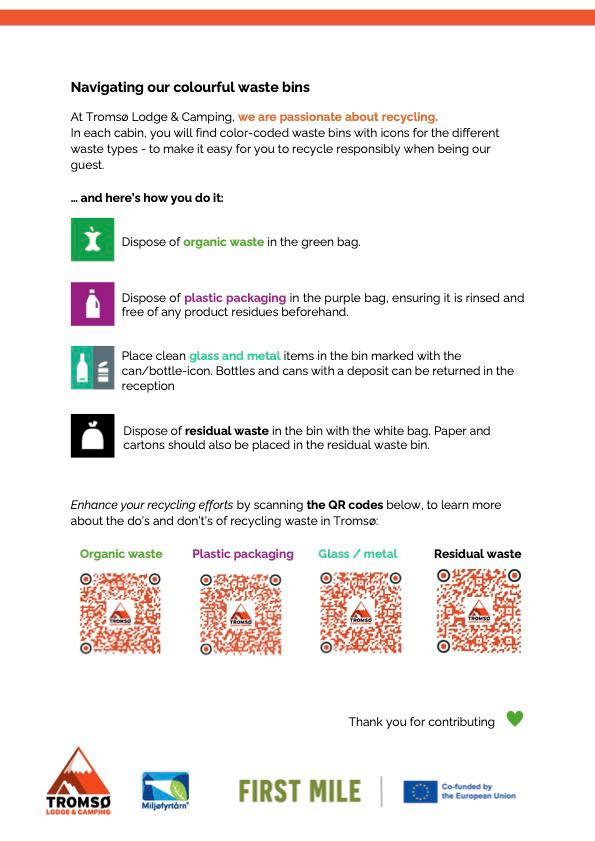 Prvi korak je zagotoviti jasne informacije in navodila o tem, kaj se od njih pričakuje. Gostje morajo vedeti, da morajo, ko se gibajo na prostem, svoje odpadke odnesti s seboj, in biti seznanjeni s tem, kje in kako jih pravilno odvreči.