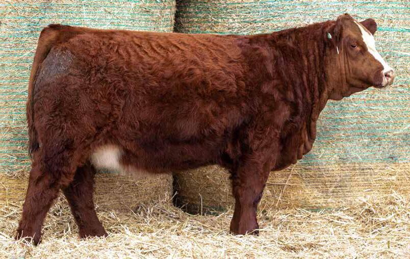 HOMO POLLED. A feature, dark red, great haired Mountain View daughter. 228L is moderate in frame but long and smooth bodied, and big hipped. 9G is a top end female with added performance, rib shape, udder quality and an attractive blazed face. Her first son sold to Siroski Simmentals for use in their heifer pen. 228L is another female we maybe should’ve saved for our fall sale, but we are always trying to bring quality to our spring sale and 228L is exactly that.