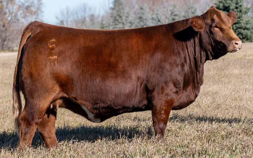 Pocahontas 119M is the kind that you want an entire herd of; long bodied, deep sided and performance based but still has an elegant look to her. Her granddam has done extremely well for us over the years and produced 126F who we have sold numerous progeny off. 119M is bred to calve early to Erixon Bloodstone who sold in our 2025 sale to Stroh’s from North Dakota. Bloodstone has curve bender numbers and has all green bars on his chart. We used him heavily in our A.I breeding program this year.