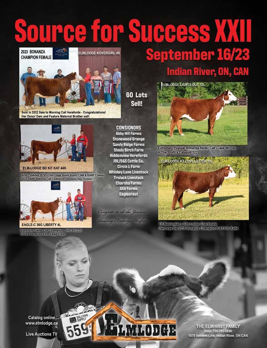 NELSON GELBVIEH Glenwood, AB 403.331.9086 nelson.lad@gmail.com SEVERTSON LAND & CATTLE Red Deer County, AB 403.224.3756 severtsoncattle.com ROCKY TOP GELBVIEH Bashaw, AB 403.350.5791 rockytopgelbvieh@hotmail.com ROYAL WESTERN GELBVIEH Red Deer County 403.588.8620 royalwesterngelbvieh.com SALES MANAGEMENT WWW.BOHRSON.COM BOHRSON MARKETING SERVICES SEVERTSON LAND & CATTLE Red Deer County, Alberta setting the industry standard for profitable genetics Monday 1 pm DECEMBER 4th 2023 38 The Gathering Sale | Dec. 04 Gelbvieh BMS REP - Scott 403-370-3010, Darryl 780-385-5561. Riley 639-213-7777
