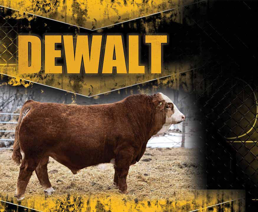 HOMOZYGOUS POLLED:: NON DILUTOR :: An absolute rarity in this homo polled, heavy muscled, stout made powerhouse Fullblood bull that brings it all together in an attractive, double goggled package. His shear mass and power with a polled head is not easily attainable and being homo polled and well pigmented is the absolute cherry on top. He was successfully campaigned as a bull calf and was praised by many astute cattleman for his sheer dimension and overall quality and was many times referred to as a “step in the right direction.” His powerful, productive dam is a top Blue Print daughter that does not miss. Dewalt brings maternal, performance and homo polled gene to the table in an elite phenotype with a great look.