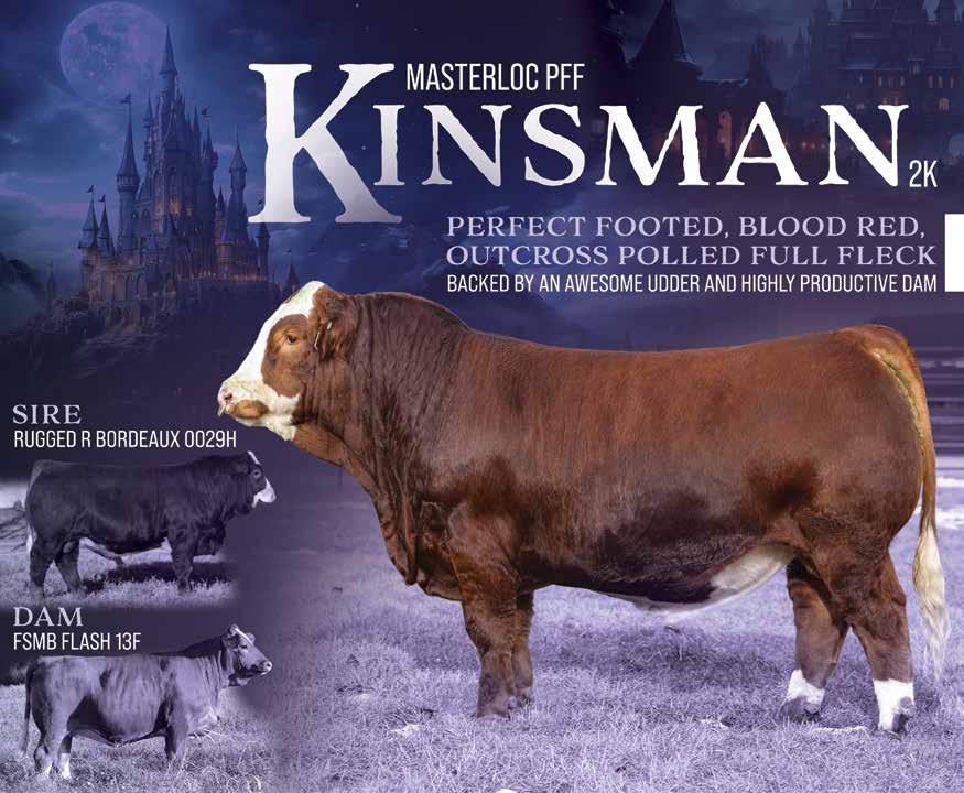 POLLED 100% FULL FLECKVIEH :: NON DILUTOR :: Masterloc Kinsman 2K is an exciting, 100% full fleck herd bull prospect that checks so many crucial boxes when selecting a sire. From the ground up, from nose to tail, Kinsman is impressive from every angle. He’s got a large, dark foot that is big and square, ample bone, lots of length of body, a big stout hip and big broad top. Kinsman is long spined, smooth made with an attractive skull and herd bull crest. Add his dark red colour and sharp pigmentation, and we believe Kinsman 2K is exactly the type of bull to sire extremely high quality progeny of both sexes. His imported sire, Bordeaux, has impressed us with his first two calf crops and the reports from folks that have purchased semen is very encouraging. Bordeaux is a breeding machine that sees double duty in two different operations and we feel he has passed on his muscle pattern, presence and so many other similarities to Kinsman 2K. As much as we love 2K and could go on and on about all of his positive attributes, maybe the best part about him is his beautiful, productive dam. Flash 13F was purchased through the Eastern Harvest from Boisvert Simmentals as a high seller that day and she has matured into an ideal cow. Near perfect udder, strong feet, big bodied and super productive. Every calf she has is a keeper and at the top of the respective contemporary group. She will be entering the donor pen soon and we feel she is exactly the type of cow you want behind your herd bull. We feel Kinsman has so much to offer the beef industry and confidently believe he will have a positive impact moving forward.