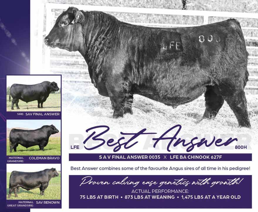 In the spring of 2022 there was a specific Angus bull heavily on our radar since our early January bull pen tours and it was the phenotypically outstanding Best Answer. His exciting calving ease numbers with added body mass and power made us quickly realize how valuable he is to todays industry. His early calf reports are proving us correct as his progeny are born with ease with lots of vigour and just starting growing, showing his broad top and thick hip at a young age. Best Answer was born to a gorgeous first calf Bravo female from one of the most productive cow families at the renowned Lewis Farms, the Chinooks. She is awesome uddered, sound footed and very angular. Her mating to the great SAV Final Answer, proved to be a home run and we are excited to carry one of the very best sons ever produced by the legendary 0035 and are excited to see more of his influence 23 years after his own birth! The good stock never go out of style and we think Best Answer is poised to make create his own great legacy with in the Angus breed.