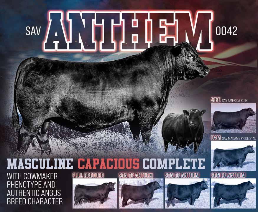 Anthem is an exciting young sire from the famed SAV America and matched up with SAV Madame Pride 3145, who Kelly Schaff has said if he had to start all over again - that would be the female he would start with. Anthem was the high selling America son in the inaugural, highly anticipated offering of 2021. Being backed 8 generations of SAV donors and by the Madame Pride cow family on both sides of his pedigree, he is stacked for maternal predictability and genetic power. Anthem himself boasted an actual weaning weight of 1,058 lbs and is in the top percentiles for WW and YW EPDs. Tie into one of the greatest breeding accomplishments in Schaff Angus Valley history, whose 25 sons averaged $19,440 in the 2024 SAV sale!