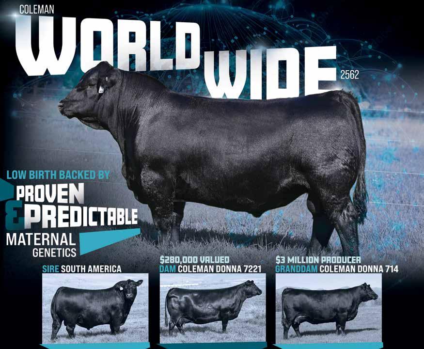 The $180,000 valued South America son is the stunning Coleman World Wide 2562. World Wide is one of the most intriguing, low birth herd bulls we have ever analyzed with unparalleled phenotype in terms of length of body with added depth of body. His muscle expression, sound skeleton and herd bull look get us very excited. His proven maternal lineage really seals the deal for us as donor dam, Donna 7221 was the $280,000 valued high seller in 2023 at the Your Maternal Source Sale and she has averaged $45,286 on 7 head sold. One of her other most notable sons is the great Poncho 9426 who is a $220,000 valued herd bull that has been used so successfully globally. World Wide is an outcross option with low birthweight genetics that we are extremely excited to see have use in Canada.