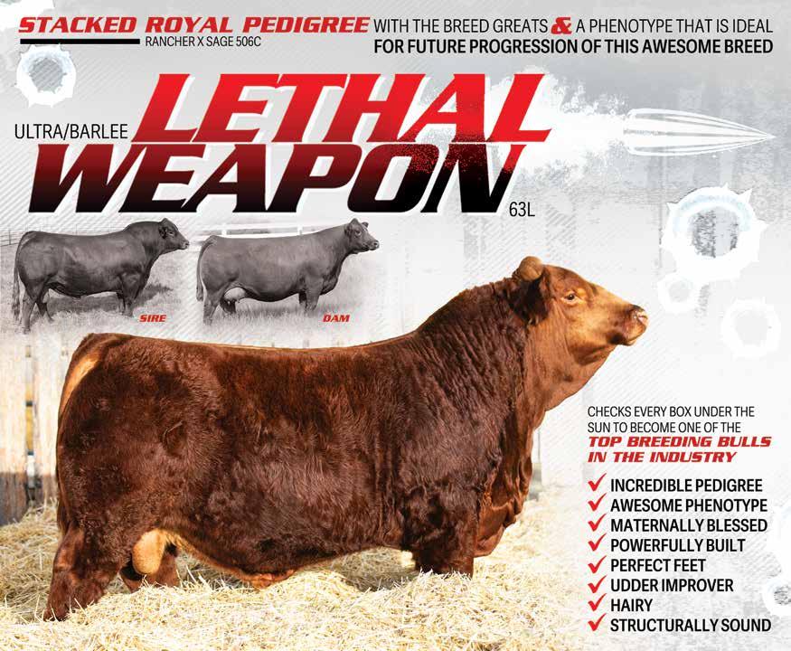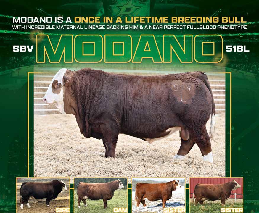 SBV Modano 518L is the $170,000 feature polled fullblood bull of the spring of 2024 that created so much interest for a wide array of reasons. Firstly, his phenotype is exceptional with dark red, strong hair coat with ideal pigmentation that attracts you to him from every angle. This awesome footed bull is extremely sound in his design and is built for longevity as his sons will be very marketable and daughters are sure to evolve into incredible cows with the udder strength and true production capabilities. Modano himself is built like an ideal horned fullblood bull but in a polled package - he is heavy muscled, long spined, big bodied, level topped, attractive headed and has a herd bull presence through his front 1/3 that is to be commended. He is a truly unique herd bull that has the pedigree to back him as well with his dams full sister bringing $60,000 and then producing a $70,000 daughter. His dams daughter commanded $85,000 in FNL and is one of the very best fullblood females ever offered at auction. Modano is a special breeding piece that we are confident that will leave a long last impression on the fullblood industry.