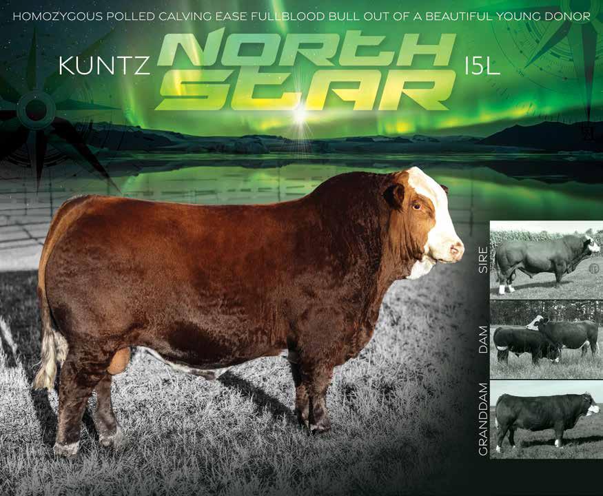 HOMOZYGOUS POLLED :: FULL FLECK :: NON-DILUTER :: Our hunt for the next great Fullblood calving ease sire brought us to the 25th Annual KMS bull sale where North Star was the top selling, $70,000 popular herdbull. His length of body, smooth silhouette, tidy skull and sound structure rank him as one of the truly elite Fullblood heifer bulls in recent memory. His donor dam stems from one of the most productive cow families in the entire breed, the Miss Moses line, which has put many bulls into top purebred and commercial operations. A maternal sister to North Stars dam also had a raised a $60,000 bull the day we acquired him and the proof was certainly in the pudding that this cow family flat out works. The Moses cows are know for being easy doing, strong uddered and highly productive no matter how they are mated. North Star is very appealing with his dark colour, double goggles, hair and Homo Polled head. We feel he has so much to offer from a calving ease and maternal standpoint that he will have a huge impact on the industry moving forward. Get in on what is surely to be one of the most accomplished breeding pieces that will be available all spring.