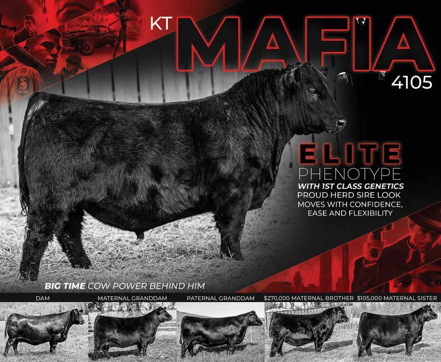 You will quickly gravitate towards KT Mafia 4105 as he moves with ease, flexibility and confidence. He carries himself with that proud herd sire demeanor, is strong topped, square hipped with plenty of muscle and dimension. Mafia 4105 is one of the very elite sons of the $350,000 S A V Panther 1906 to sell in Canada this spring. The mating between Panther and Countess 9026 left a high-quality set of bulls and females at KT Ranches, with two heifers being highlights in their 2024 Production Sale to ZWT and Seager Anderson. The Countess Cow Family is highly regarded for their stunning phenotype and production record. Mafia’s dam, Countess 9026 and Grandam, Countess 7077, were one of the finest pairs showcased in recent years winning Supreme Champion Female at both FarmFair and Agribition. An Elite phenotype with first class genetics will put KT Mafia 4105 on everyone’s radar for the future!