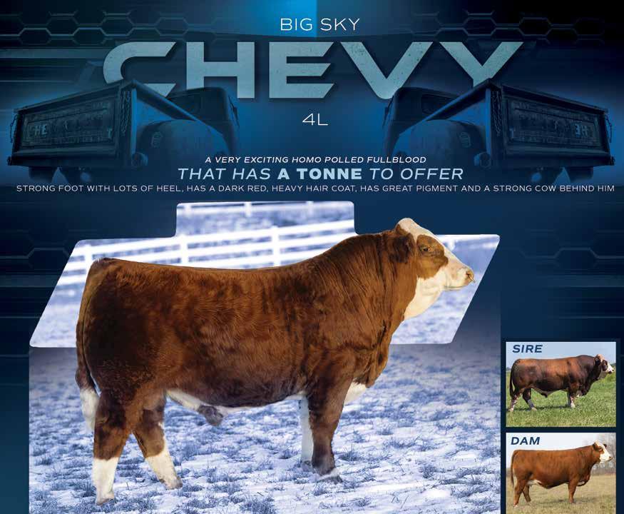 HOMOZYGOUS POLLED :: FULL FLECK :: NON-DILUTER :: A very exciting, homo polled Fullblood that brings so much to the table! After an impressive summer show run in Manitoba and making a pile of friends at the Mantioba Ag-Ex, Chevy was taken into serious consideration to add to our sire line up. The best way we can describe him is that he resembles a horned fullblood in his loose hideness, huge hip and dense build all while remaining extremely smooth and fluen in his joints and movement. Chevy transitions from front to back so effortlessly. Stands on a strong foot with lots of heel, has a dark red, heavy hair coat, has great pigment and a strong cow behind him. His mother, Halo 4H, is a powerful brood cow that checks all the fundamental boxes. She is striking at every angle and has a really strong udder. We think Chevy has a tonne to offer the industry and being homo polled really is the cherry on top.