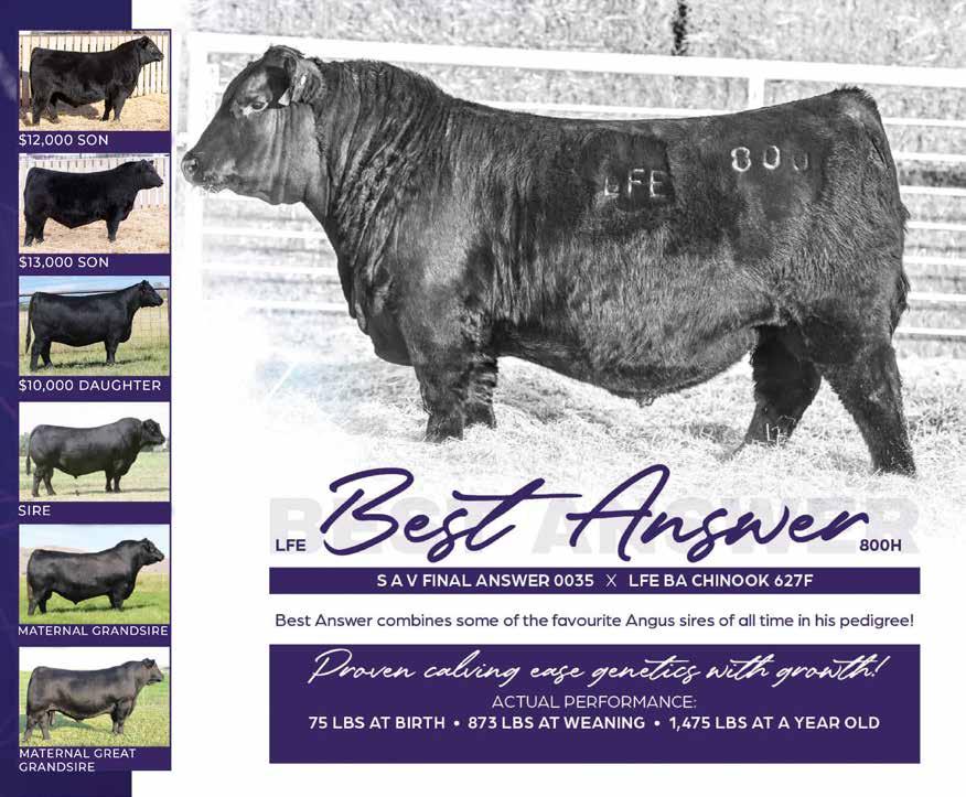 In the spring of 2022 there was a specific Angus bull heavily on our radar since our early January bull pen tours and it was the phenotypically outstanding Best Answer. His exciting calving ease numbers with added body mass and power made us quickly realize how valuable he is to todays industry. His early calf reports are proving us correct as his progeny are born with ease with lots of vigour and just starting growing, showing his broad top and thick hip at a young age. Best Answer was born to a gorgeous first calf Bravo female from one of the most productive cow families at the renowned Lewis Farms, the Chinooks. She is awesome uddered, sound footed and very angular. Her mating to the great SAV Final Answer, proved to be a home run and we are excited to carry one of the very best sons ever produced by the legendary 0035 and are excited to see more of his influence 23 years after his own birth! The good stock never go out of style and we think Best Answer is poised to make create his own great legacy with in the Angus breed.