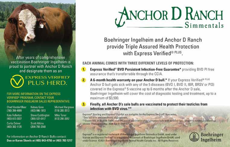 LEFT FREE OF CHARGE at Anchor D Ranch Simmentals till April 1, 2023, see Terms and Conditions for complete details. Must be insured. Delivery $100 OFF Any bull picked up sale day FREE DELIVERY to Central Regions in Western Canada - other area delivery see Terms & Conditions for details or or