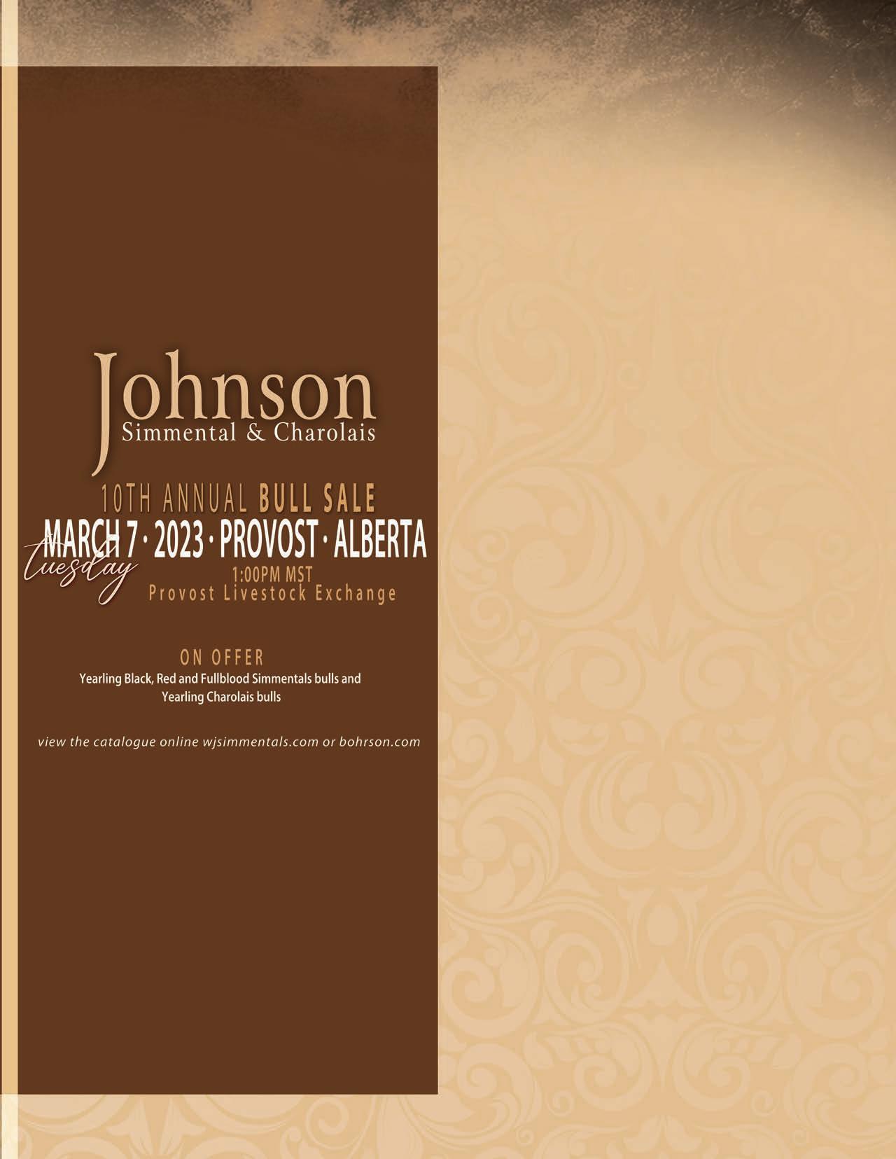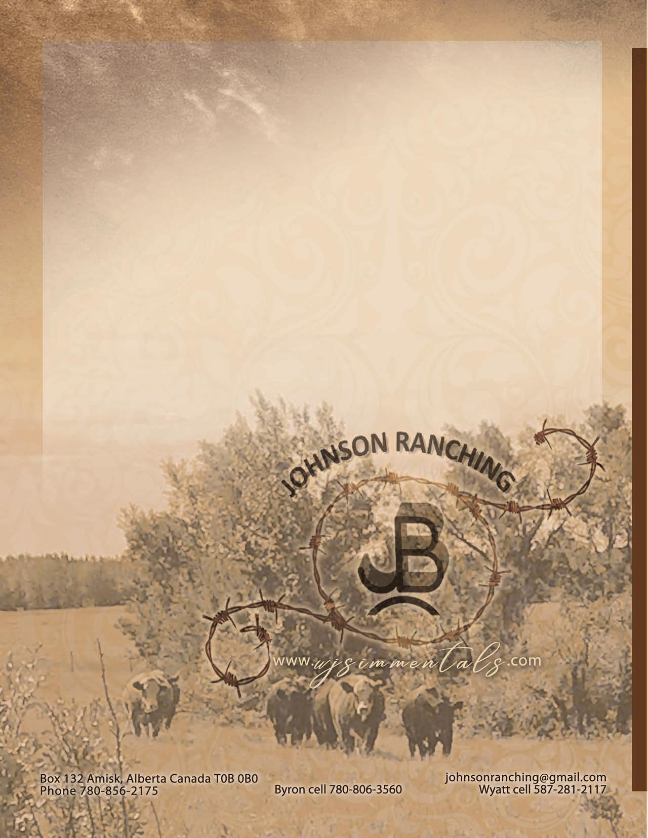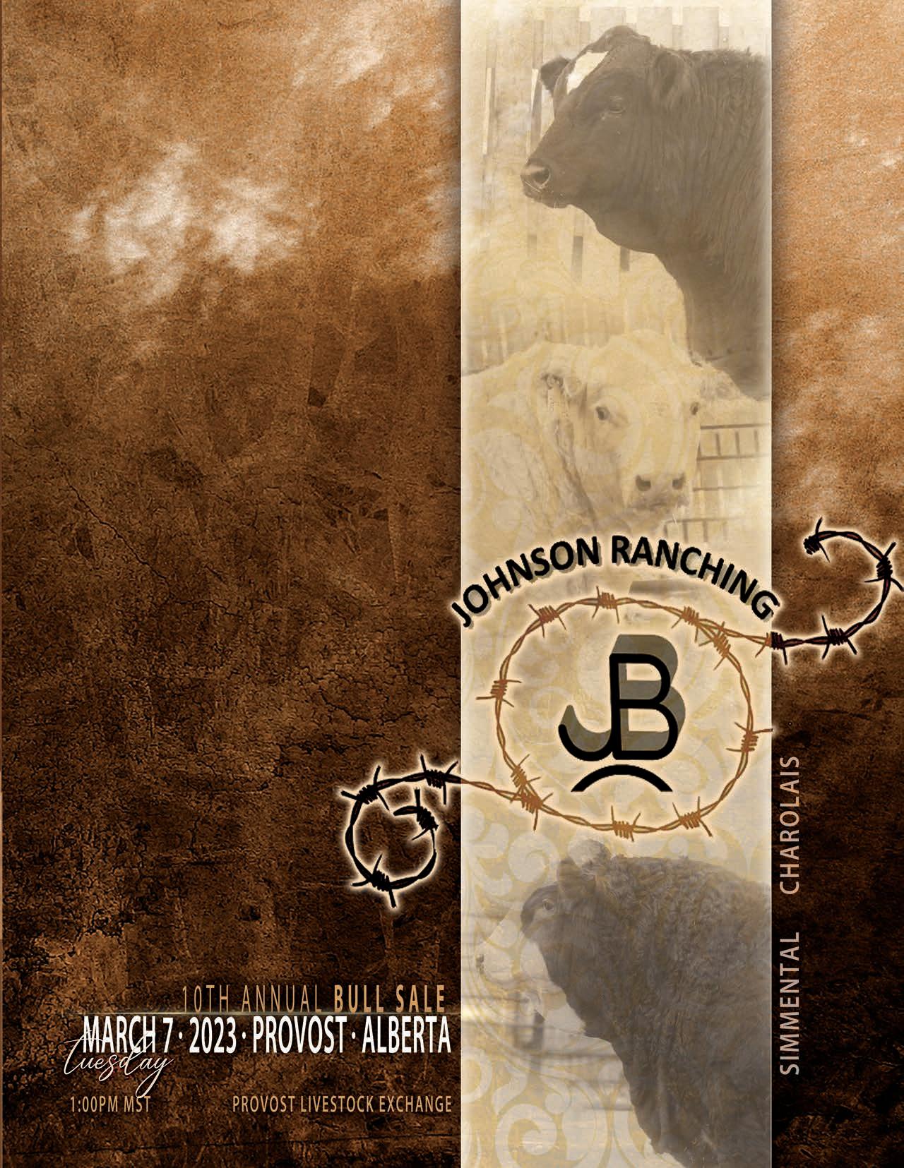Hello and welcome to the 10th annual Johnson Ranching Bull Sale. The time has sure gone by fast as it’s hard to believe this is our 10th sale and 15th year selling bulls already. Our offering of Charolais and Simmental bulls are deep in quality with many highlights in every color. As always we continue to dig in deep and source high quality herd bulls that carry the traits you as our customers are looking for. Our sale bulls are backed by easy doing functional cows with udders and foot quality of utmost importance. Our bulls are fed a high forage balanced TMR designed to promote growth. We would like to take this time to thank everyone who has played a part in the last 15 years, and to our many previous and repeat buyers for your support it truly means a lot we can’t do this without you. To all our new buyers thanks in advance we look forward to working with you. The bull pens are open for viewing any time and encourage you to come to the farm and go through the bulls. The professional and knowledgeable staff of Provost Livestock as well as Borhson Marketing and DLMS will be there to assist anyone unable to attend.