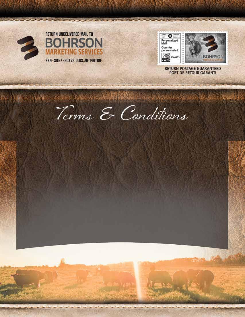 on March 23 DWAYANN DOREEN 33H 1323295 | 1 SEPTEMBER 2020 | DAH 33H |24 DUKE 223P KNIGHT MR T 255T MISS KNIGHT 108N CAREW’S ADZE 3B CAREW’S DEMI 11D WLSF PEGEMBU 5TH SIM-ROC C&B WESTERN 6924682 KING ARTHUR MISS KNIGHT 100F WLSF ABESLY LEAHY’S LIZA 6X WLSF ABNER WLSF PEGEMBU CE BW WW YW MLK MCE MWW 2.7 7.4 74 103.8 36.1 2.4 73.1 Act BW Adj WWAdj YW 91 639 n/a Melinda is a powerful polled heifer from a first calving Balist heifer going back to an excellent Maltese cow that we bought from Gagnons, she’s still going strong at Carew’s at 14 years of age. Bred to the proven calving ease Benz bull, as with all our sale heifers she sells with no exposure to bulls. Bred to Bar 5 Sa Benz 415L (559543) on April 11 DWAYANN MELINDA 35H P1323673 | 4 SEPTEMBER 2020 | DAH 35H |25 BEE PHANTOM 79B FAIRVIEW PHILOSOPHY 99E STARWEST POL ARIEL BALIST DWAYANN MELANIE 45F DWAYANN MELISSA 1A ANCHOR D VIPER 103W BEECH BRO SHE DEVIL 12S LHVS COMMANDER 59X PARVIEW’S MISS FROSTY 55X BALDO TIMES LEONARDO FGAF MISS MALTESE 510U CE BW WW YW MLK MCE MWW 10.6 2.1 60.4 87.7 35.4 6.665.6 Act BW Adj WWAdj YW 73 609 n/a HORNED FLECKVIEH HORNED FLECKVIEH POLLED FLECKVIEH HORNED FLECKVIEH Sire - Hockenhull Marvel Service Sire of Lots 23, 24, 26 31 Rugged R Cavill Dam of 33H with 33H at side Granddam - DAH Melissa 1A $8,500 Marasseh Fleckvieh $9,250 Virginia Ranch $7,000 G&LMacDonald