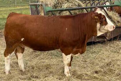 Our only Ford daughter in the sale this year. She is a member of the Knights Shyann cow family that has been a founding influence of our Fleckvieh program. If she follows in the footsteps of our other Shyann progeny in the herd, she should not disappoint. Bred to Simmeron Mr. Royal