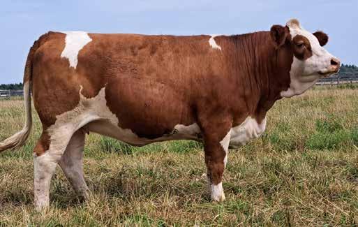 Miss Liberty has always been a favorite. She is a perfect example of those Anchor D Raptor females. She is perfectly marked, big dark goggles and very correct. She is from an extremely productive moderate framed cow we bought from Cedar Creek Simmentals in the Ferme Gagnon sale. She is just a no miss cow that is raising a very good bull calf this year. Liberty is developing a beautiful udder. There is just something special about Raptor females. She is bred nice and early to the homo-polled calving ease sire KSL Jesse James. AI’d to KSL Jesse James March 9 (safe)