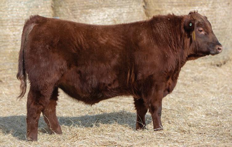 This stout made, deep sided, dark red Township son is a favourite in the two year old pen. He’s cocky fronted, nice headed and very good footed. His dam Red SVR Ruby 170D raises a very good one every year with a perfect udder and is extremely easy doing