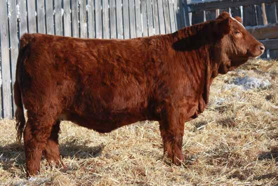 Homo Polled. Cruise is a real interesting calf and one we really like. We seriously considered keeping him ourselves but when you see how many he is related to around here it gets tough to justify. He is a dark red hairy Tycoon son with plenty of length and when you look from behind a big wide top and hip that carries down into his quarter. Cruise is the calving ease option in the Tycoon sire group. With just an 82 lb birthweight and EPD’s that put him into the top 25% for calving ease & top 10% for birthweight. He has the potential to work on well developed heifers & young cows. His dam Sassy 75G is one of my favourite you cows. She boasts a good udder, moderate frame and real good feet. Her two year old Strut daughter just calved here the other day and looks great.