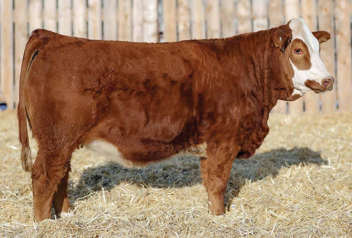 Freda is definitely one heifer with lots of potential. Being the daughter from our Lenny bull and a first calving heifer CWS 17H, they produced a good one. We expect Freda to develop into a powerful cow with a lot of depth and a great udder. Her grandmother was selected from our friends at Virginia Ranch; she cows back to one of the Banker daughters purchased by Randy Ward from Smith Simmentals. Freda is one heifer that I would really have liked to keep around as I believe there is some genetic potential in this cross. I am confident she will go on to raise some great ones. 100% Full Fleckvieh.