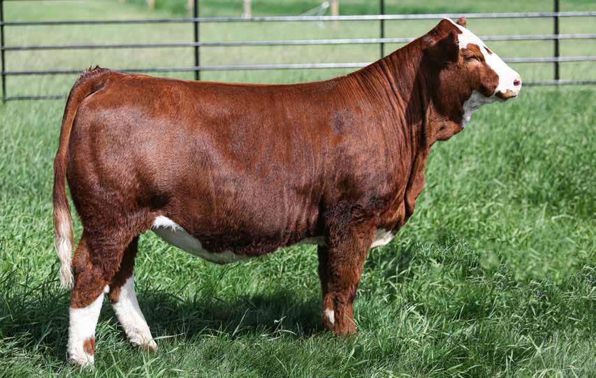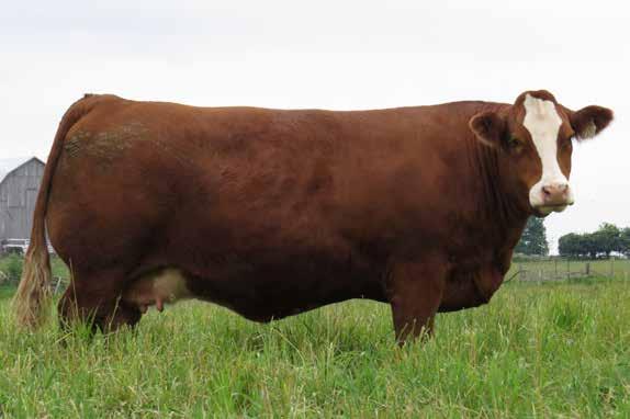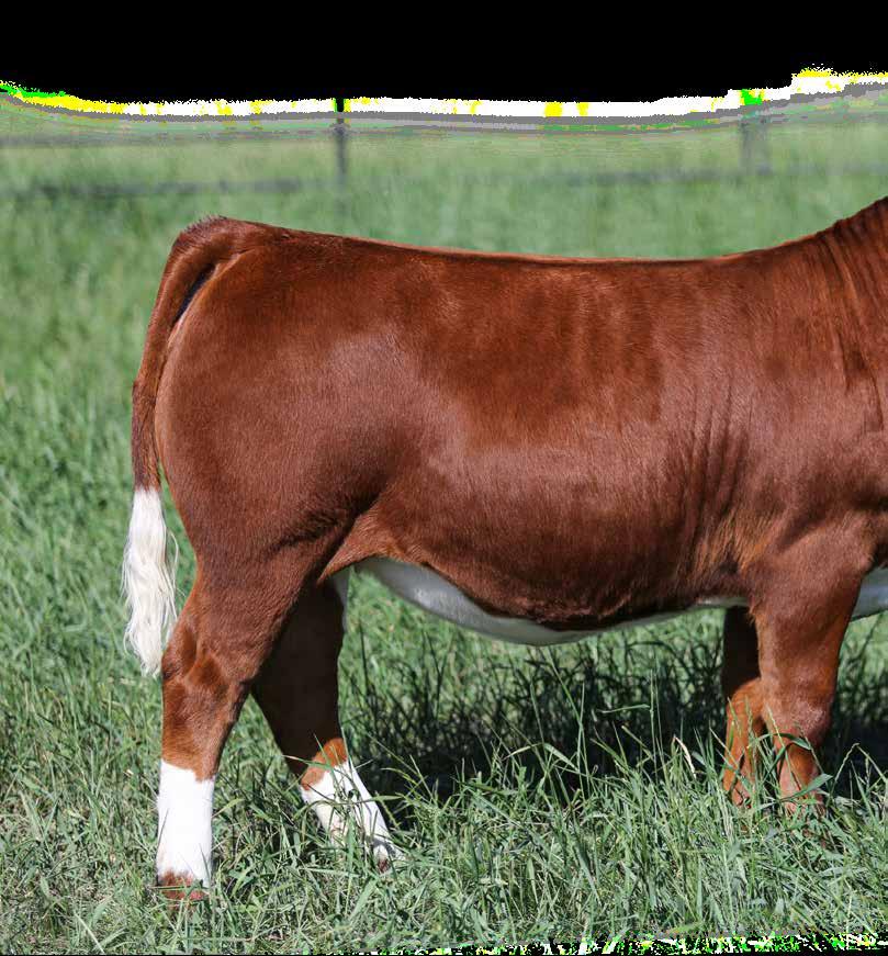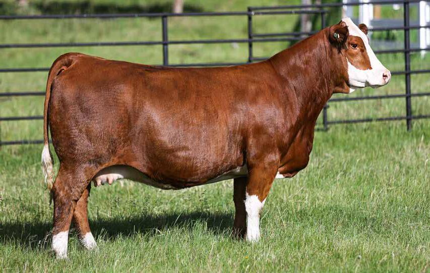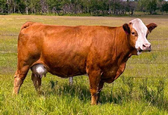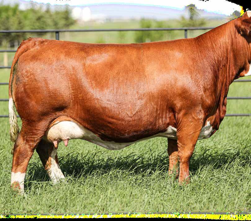 Storm 123M is a product of many generations of excellent uddered, super sound, performance-based females, that have shown successfully, and whose progeny have topped our bull and female sales. Her dam 13G was Champion Heifer at SCPS and a member of our Champion Pen of Heifers at the MHPS as a calf. She’s had 2 other daughters; a sweetheart, flawless uddered, 2 yr. old - Storm 255K, and a full sib to 123M - Storm 255L, that we showed last fall. Grandam is a long bodied, powerful, top producing, “Sweet Meat” daughter, who also put 2 bulls in our show string. Great Grandam Storm 11X is still in production at 14 years old. Her structure and udder quality are still nearly as good as the picture taken of her at 4 yrs. old. Her daughter 42B has been crowned Champion at SCPS 3 times including last year at 9 yrs old. Great Great Grandam 405P was a favourite on this place; 6 of 10 of her sons and daughters were shown! 2 more generations back is Storm 73F; the first Simmental that was born at my parents’ place, Kimlake Farms. To say this cow family is near and dear to our hearts would be an understatement. 123M’s sire, Great Western 151G, has been used heavily the last 2 breeding seasons in our herd. We love his phenotype, and he breeds true to his form. Many beautiful cows back him. We’re looking forward to calving out his daughters. 123M has endless potential, with so much longevity, style, and generations of highly productive cows backing her. CONSIGNED BY BOUNDARY RANCH LTD.