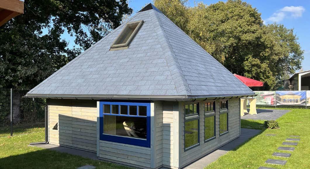 • Pour les modèles pavillon (diamètre max. 4,0 m), les éléments de surface de toiture sont pré-assemblés et peuvent être fournis avec un revêtement en bardeaux sur demande.”