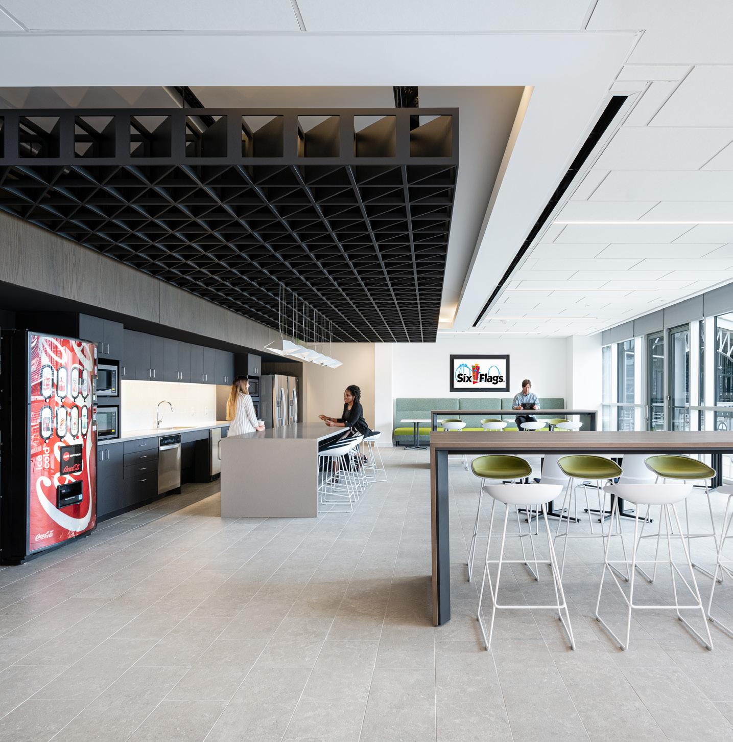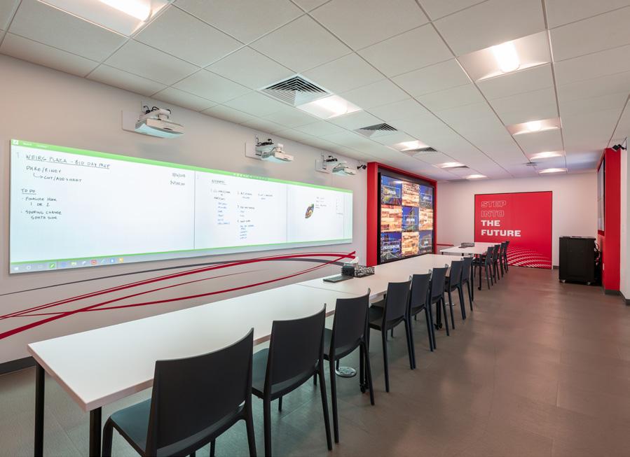 Suffolk Construction’s Dallas office places technology front and center, showcasing the firm’s commitment to cutting-edge pre-construction and construction management processes from the moment clients and guests enter the space. Located right off the lobby, the Smart Lab includes wide-format projection screens and teleconferencing tools to facilitate discussion. Notes are then captured and stored in Suffolk’s cloud system. Design features include metal ceiling panels that emphasize the company’s forward thinking approach, as well as openstructure ceilings and exposed columns that highlight the building systems. Wood tones and accents and specialty lighting throughout the space add warmth and sophistication.