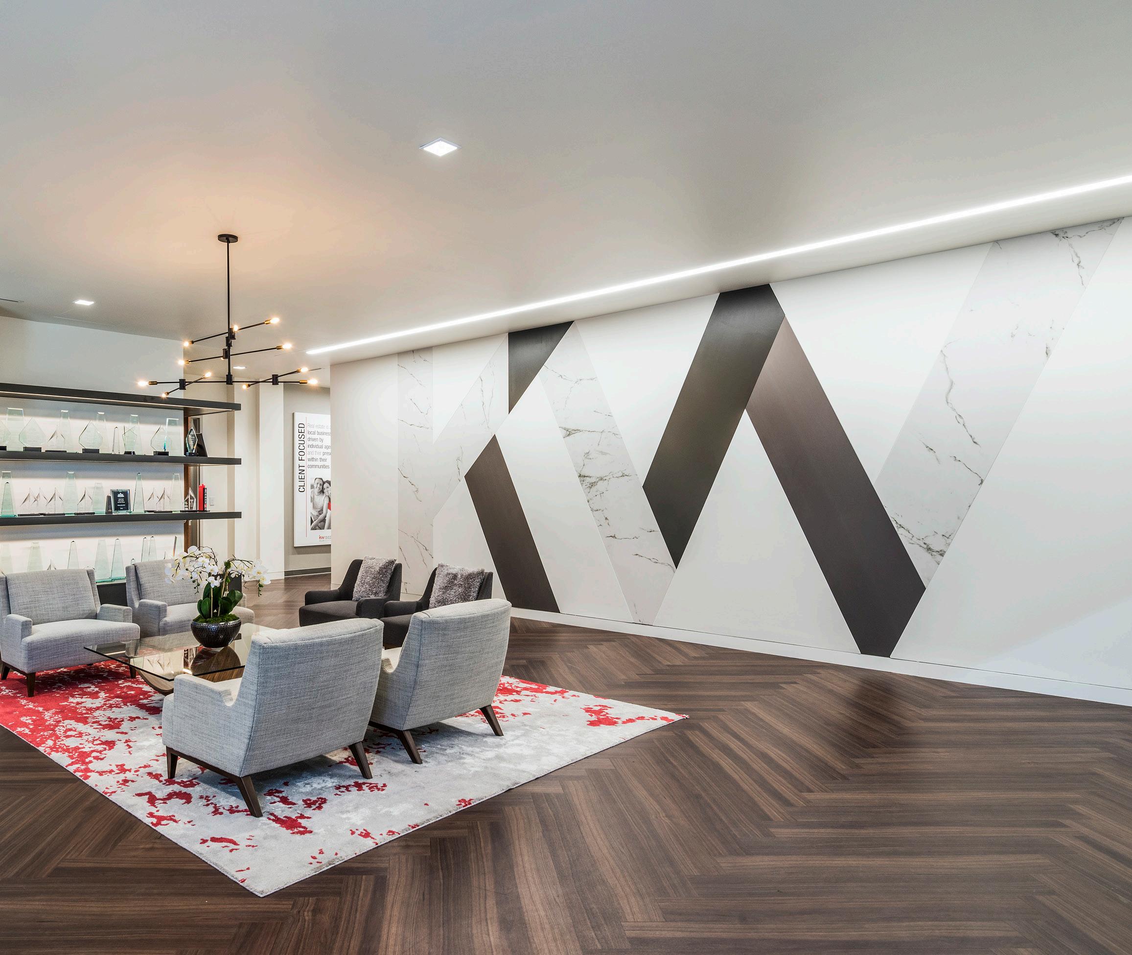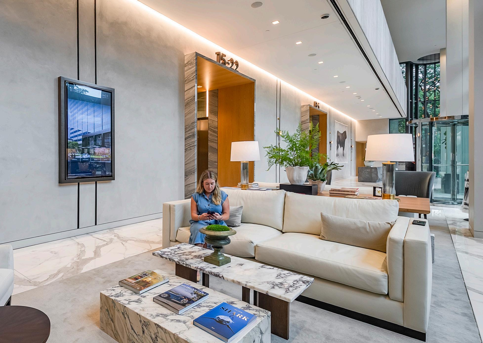 Located at 13355 Noel Road in Dallas, One Galleria Office Tower is a 25-story, 478,000-squarefoot Class A landmark seamlessly connected to the Galleria Dallas Mall, the Westin Galleria, and over 200 nearby shops and restaurants. Piedmont Realty Group partnered with BOKA Powell to reimagine the tower’s end-user experience and amenities, transforming dated interiors into a refined, hospitality-driven environment. The renovation introduced elegant lounges, wellness spaces, and an elevated boardroom—dubbed the “jewel box”—featuring deep tones, Platino Quartzite, navy hues, and warm plaster finishes accented by cove lighting. Spanning the basement through the third floor, the redesign balances polish and comfort while aligning with modern workplace trends. Positioned at the intersection of the Dallas North Tollway and I-635, One Galleria Tower offers prime connectivity and is LEED Gold certified, Energy Star compliant, WELL-rated, and part of the BOMA360 Performance Program, reflecting its commitment to sustainability and wellness.