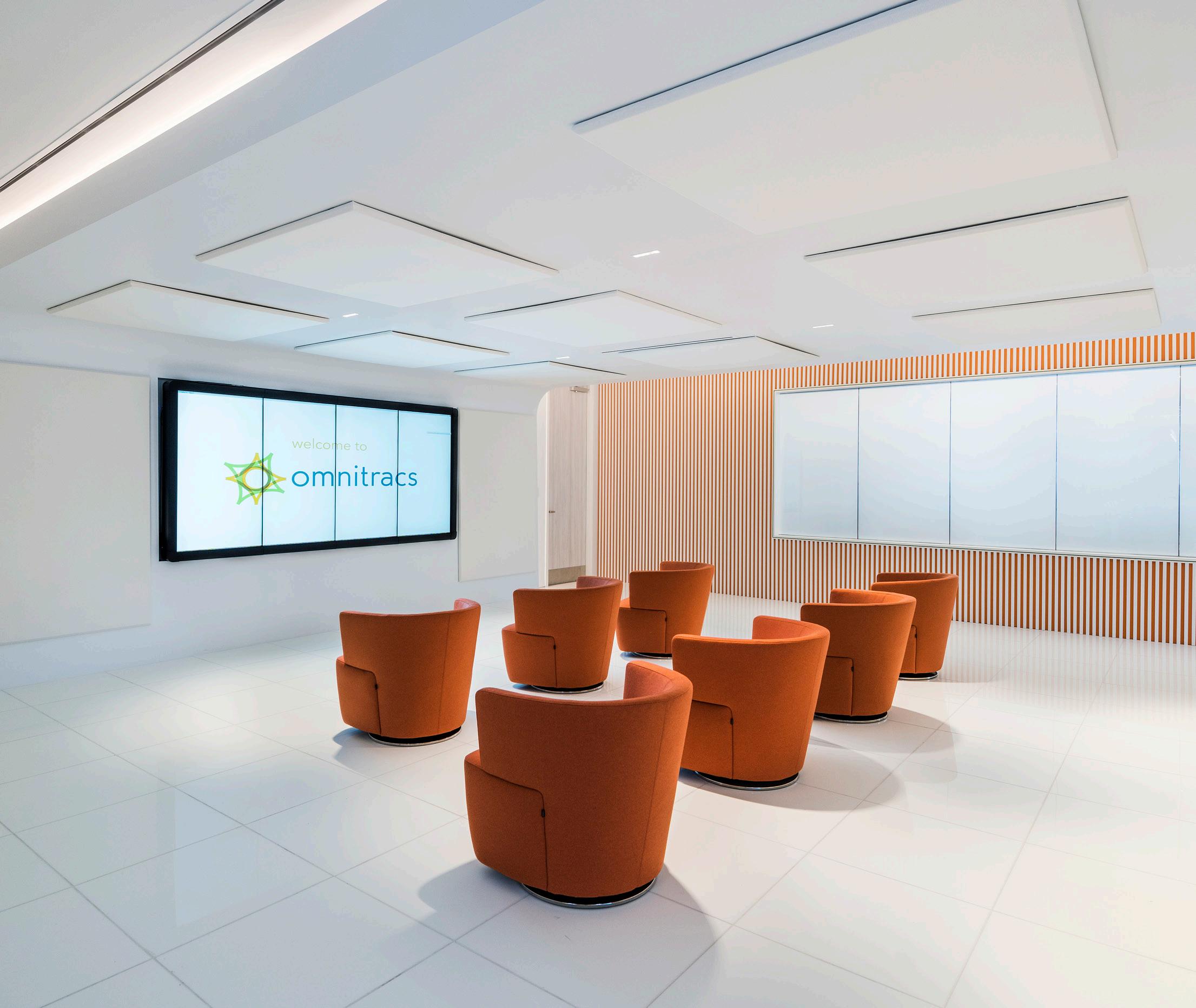 In addition to building out more office area for Omnitracs’ rapidly growing business, the client sought to create a Customer Experience Center within their headquarters to have the ability to showcase their products and technology in a compelling manner. At approx. 3000 square feet, the experience begins with a welcoming vestibule for clients to gather and debrief before fully entering the CEC. The conference room has a variety of lighting controls, allowing for flexibility during a presentation, along with video conference capabilities. To one end of the room pivot doors open up to a prep kitchen where guests can step out for a phone call or grab refreshments. Lastly, there is switchable LCD glass that can be turned off to reveal Omnitracs NOC working in real-time, offering a peek behind the operations.