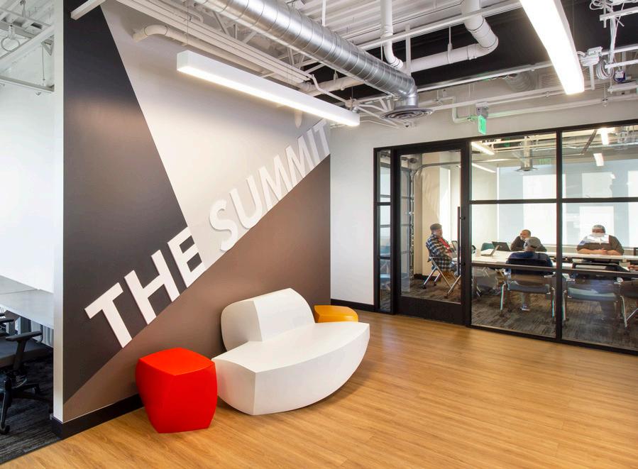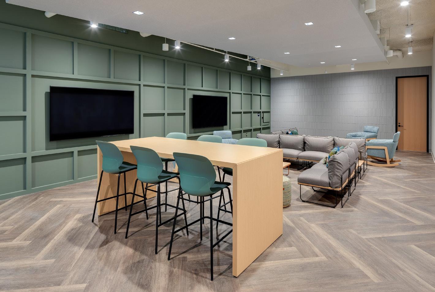 core is wrapped in rich wood evocative of a massive tree trunk that lends heartiness and warmth. Low and grounded, workstations promote collaboration and mentorship among employees, key to Stream’s horizontal corporate culture. The office is divided into quadrants rippling outward from the elevator lobby. An ideal venue for corporate events and meetings, the flexible lobby area serves as a reception and prefunction area and spills into adjacent conference rooms that expand to host large gatherings of a hundred or more. A large break room features a variety of seating options and provides both opportunities for lively office functions, and a calm, peaceful refuge from a fastpaced work day.