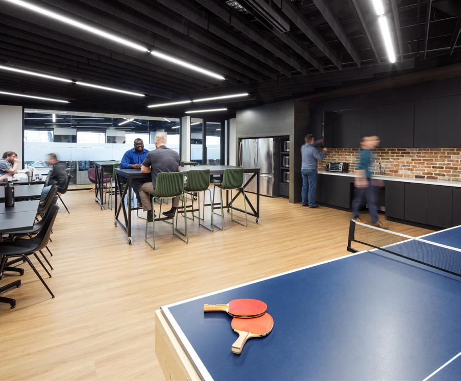 Pacheco Koch, a civil engineering firm, and BOKA Powell have nurtured a longterm relationship, having worked on numerous projects together. Naturally when Pacheco Koch began to expand their Fort Worth office, they engaged BOKA Powell to design a new office with the idea of “open space” in mind. Though most of the space was open, there are several perimeter offices as well. Pacheco Koch wanted to bring a vibrant and collaborative environment to their employees so they incorporated large employee break area with space for recreation activities like ping-pong. Light modern finishes and cloud ceiling panels for acoustics mixed within tall exposed structure allowed Pacheco Koch to stay true to their design