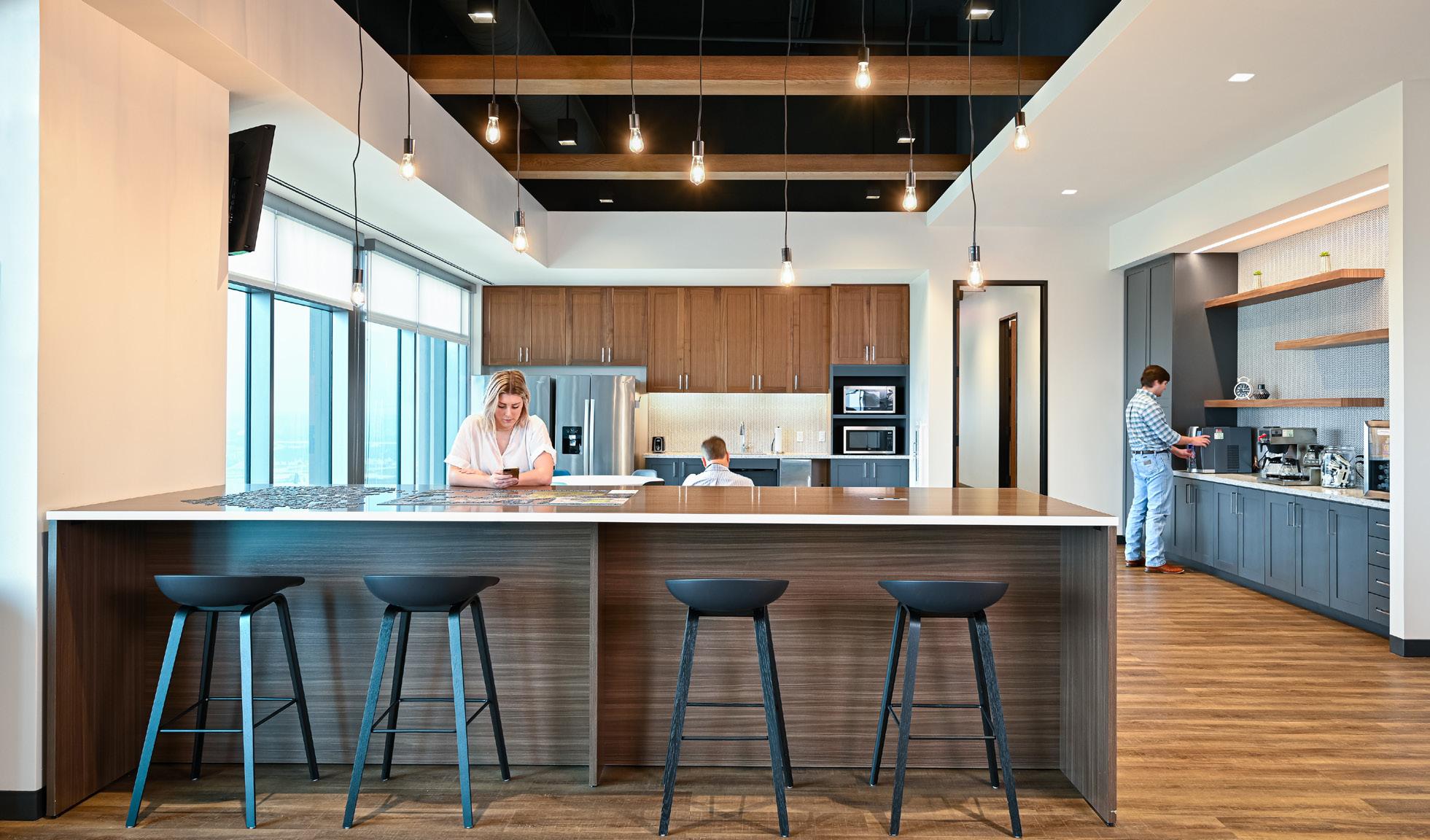 Bright Realty commissioned BOKA Powell to design their 52,000 SF headquarters, spanning two levels, at The Realm at Castle Hills, a new 230,000 SF high-rise Class A office building in Lewisville, also designed by BOKA Powell. As commercial and single-family home developer, Bright Realty wanted the space to have a residential feel throughout. Exterior materials, like brick, combined with heavy timber and shaker-style millwork, emphasize the company’s role in home building. Bright Realty’s brand identity is also interpreted creatively in laser-cut steel and the use of its color palette in tile and paint. Accentuating the tall ceilings, faux timber beams in common areas like the break room, are evocative of traditional style homes. Ceilings along major circulation corridors are furred down to create a visible pathway, while they are left open to structure with suspended lighting in open office areas. Each floor has a flow between the different departments with nothing walled off but rather separated with a hallway or an open portal. As you walk each floor, you will see that each floor incorporates special programmatic and design elements to reflect and support the departments located there. Teams with complementary functions are adjacent to one another to facilitate workflows between them. Executives enjoy generous offices with private bathrooms and showers. A “Plan Review Room” offers ample layout space to support team meetings while discussing drawings. A folding wall system opens to a large balcony offering spectacular views of Bright Realty’s land holdings surrounding the office tower.