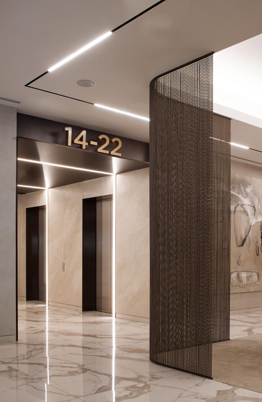 Ross Tower is a 45 story, Class A office tower in Dallas’ downtown. It is a 1980s building within walking distance from Klyde Warren Park and a resurgence of new living and dining venues. The project entailed renovating the arrival and lobby experience while working within the existing building language and aesthetic. A revitalized front entrance was created by adding a grand porte-cochere, clearing the grounds and incorporating a coffee shop at the ground level. Marble, solid walnut, brushed metal, plush wool rugs, sophisticated leather furnishings and pops of color and texture add interest and variety to the spaces. This renovation connects the building to the pedestrian space at the corner of North Akard and San Jacinto with a drop-off, outdoor seating, and covered pedestrian routes; therefore energizing the street level.