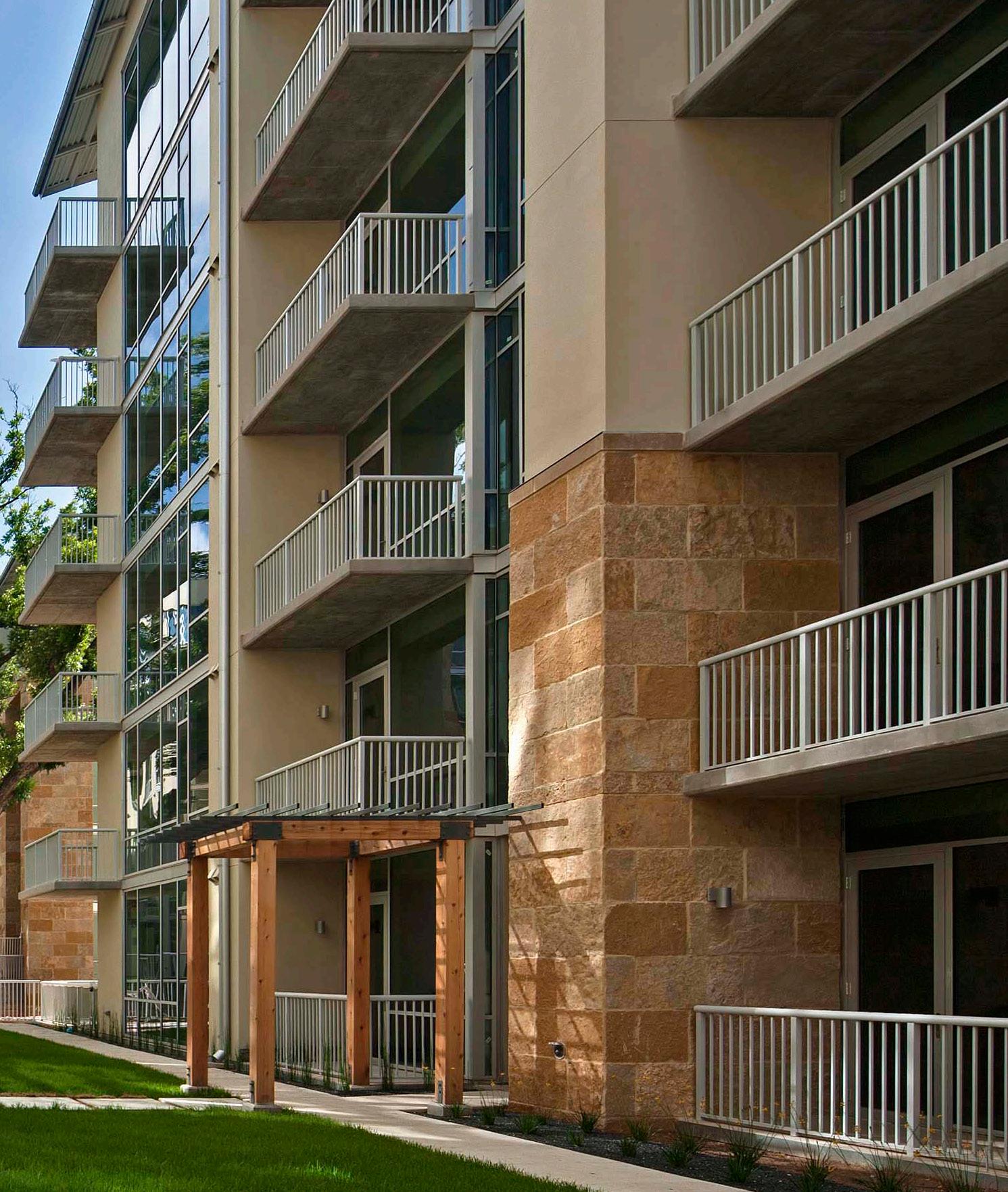 Barton Place is a six-story condominium complex located south of downtown Austin. Six buildings are arranged around an elevated plaza featuring a historic 100 foot tall pecan tree and native plants, all carefully preserved during construction. The 300,000 square foot condominium complex is strategically located near Zilker Park and Barton Springs, two very popular inner-city public amenities. The Hill Country-modern architecture features an energy-efficient exterior combining locally-sourced stone, floor-to-ceiling glass, concrete, and stucco.